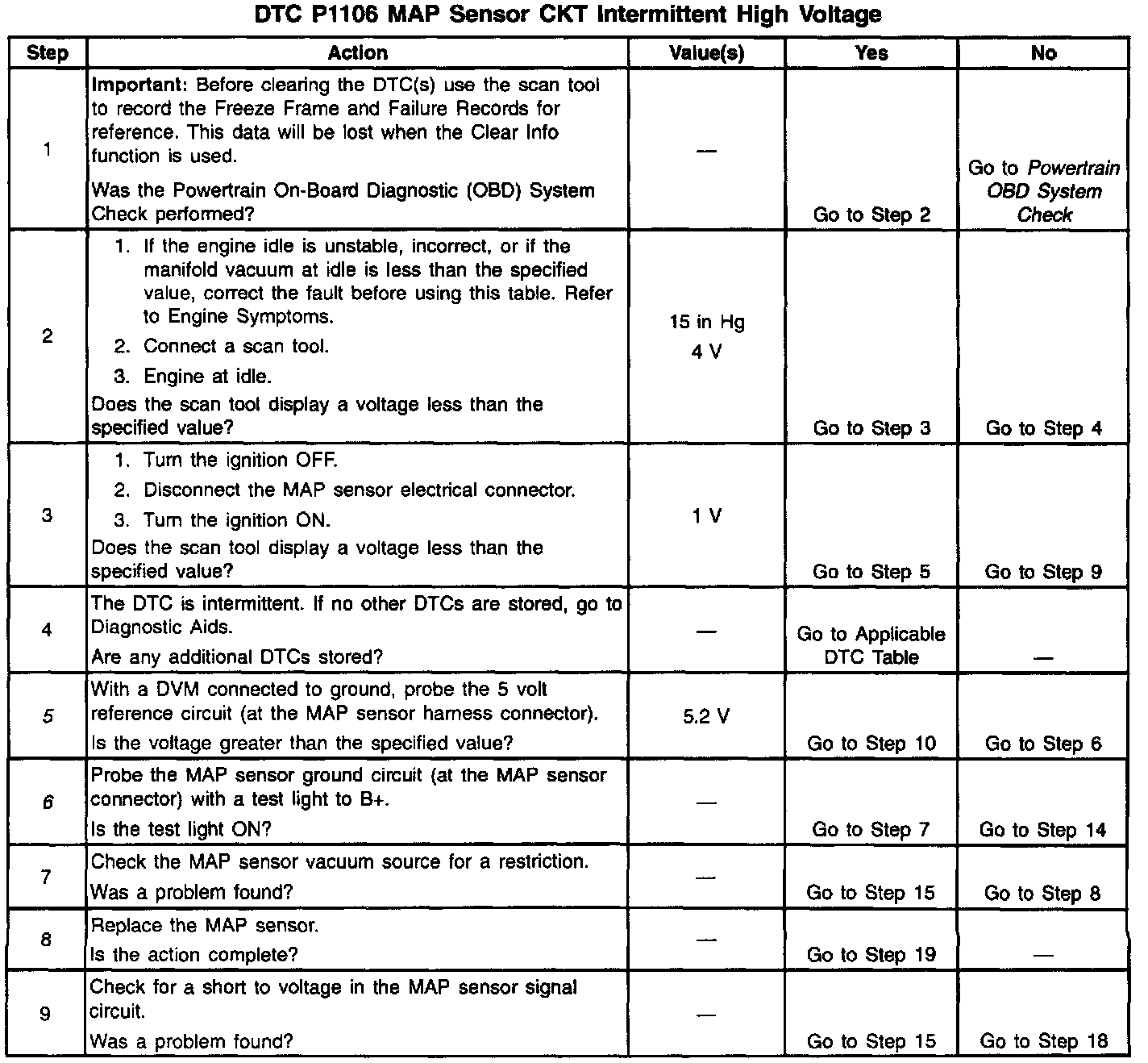 The Manifold Absolute Pressure (MAP) sensor responds to changes in the intake manifold pressure (vacuum). A 5 volt reference is applied to the sensor on the 5 volt reference circuit. A variable resistor moves in relation to the manifold pressure and a voltage signal is sent back to the VCM on the MAP sensor signal circuit. This voltage signal will vary from 1.0-1.5 volts at closed throttle to 4.0-4.6 volts at wide open throttle (low vacuum). The VCM utilizes the MAP signal and the throttle position in order to determine the correct amount of fuel delivered to the engine. This DTC is a type D DTC.