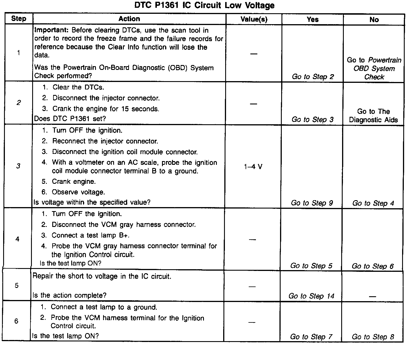 9. The remaining tests begins to check that the ignition coil module circuitry is OK. If the ignition coil module loses its voltage source, the secondary voltage will not be produced, and a DTC P1361 will set.