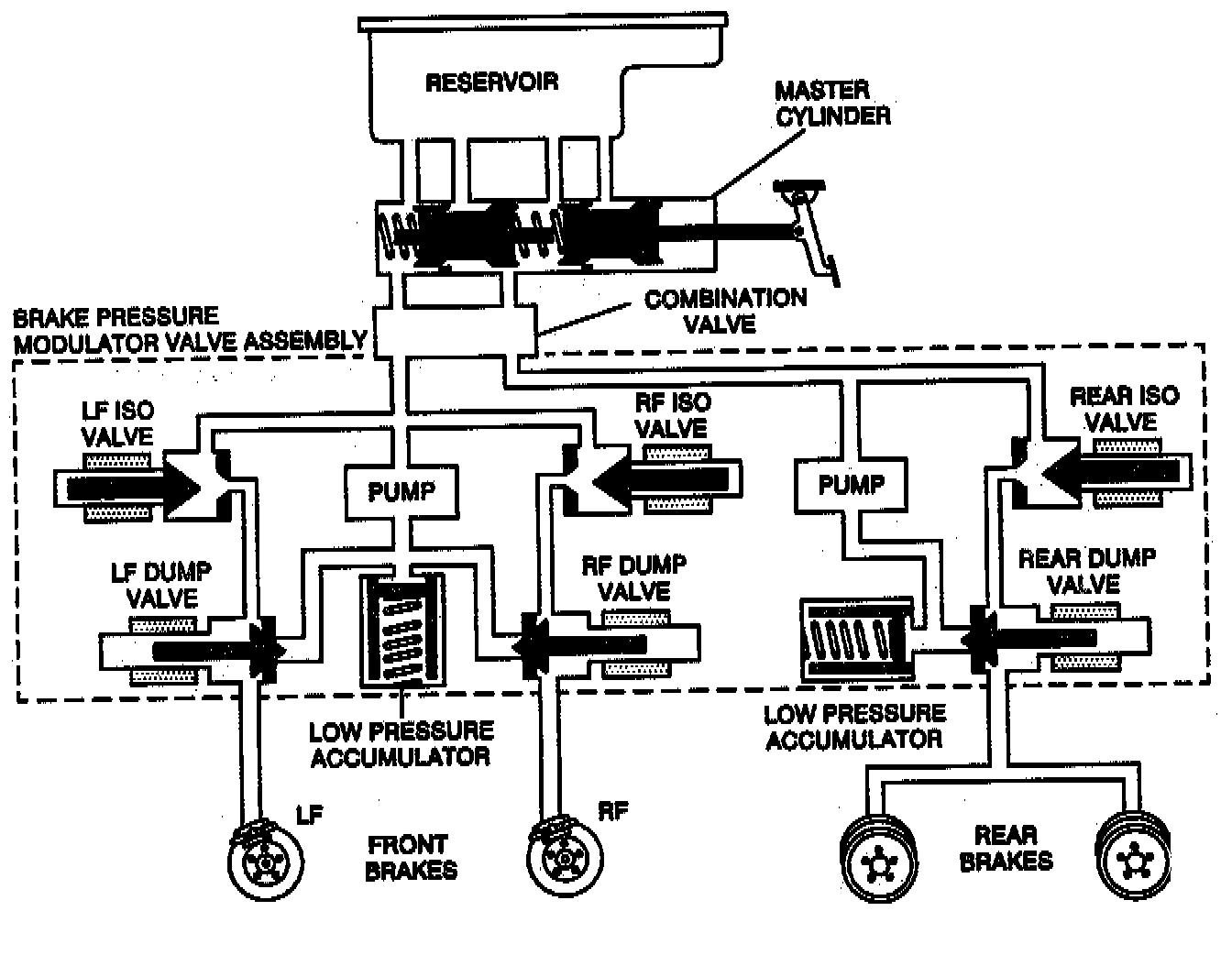 During normal braking, pressure is applied through the brake pedal. Fluid comes from the master cylinder, through the combination valve and into the Brake Pressure Modulator Valve (BPMV). The fluid travels through the normally-open Isolation Valve (ISO), past the normally-closed dump valve and out into the brakes.