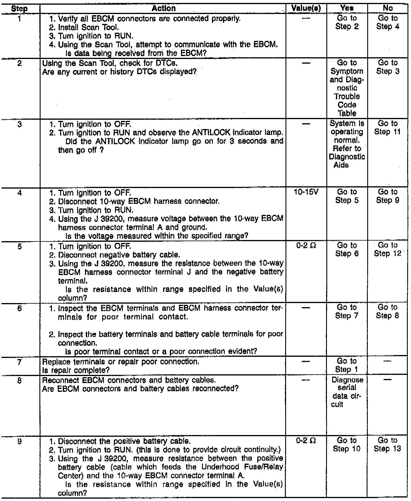 Using the Scan Tool, communication with the EBCM can be attempted by reading a Diagnostic Trouble Code (DTC) or by reading the data list. Excessive resistance in the ground or power supply circuits will not allow communication with the EBCM. If communication with the EBCM is not possible, ensure the ABS ground connection is good and that there is no excessive resistance in any of the power supply circuits.