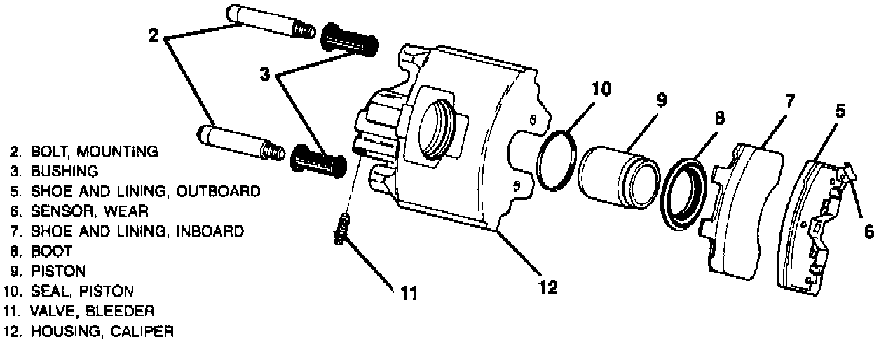 4. Piston (9) and boot into caliper bore.