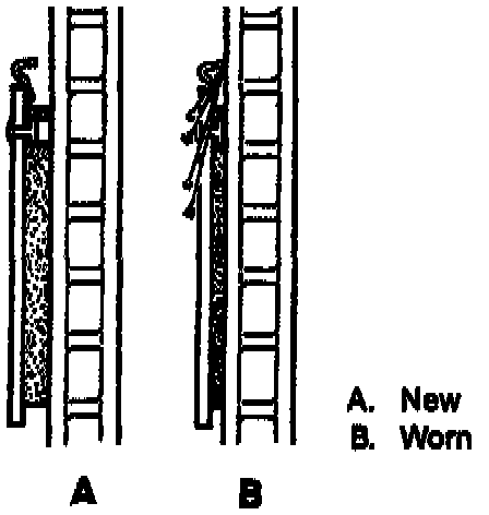 Inspect the brake linings every 6,000 miles and any time the wheels are removed (tire rotation, etc.). Check both ends of the outer lining by looking in at each end of the caliper. These are the points where the highest rate of wear normally occurs. At the same time, check the thickness of thinner lining to make sure it has not worn prematurely. Some inboard shoe and linings have a thermal layer against the shoe, integrally molded with the lining. This extra layer should not be confused with uneven inboard-outboard lining wear.