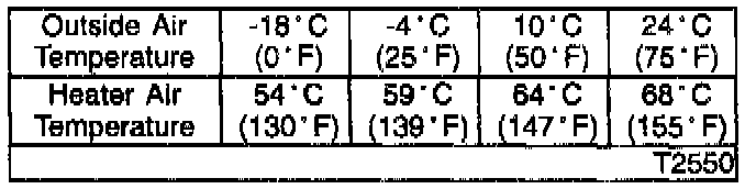 When the engine is warmed up (after approximately 20 minutes of operation), drive the vehicle. Use an accurate thermometer to determine the temperature of the outside air and the temperature of the air discharged at the floor outlets with the vehicle moving at 48 km/h (30 mph). Minimum acceptable heater output temperatures at four different outside air temperatures are shown in the table below.