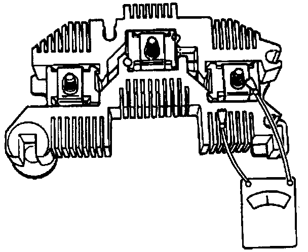 To test the rectifier bridge, connect an ohmmeter to the grounded heat sink and one of the three terminals, pressing down firmly on the flat metal clip. Observe the ohmmeter adding and reverse the lead connectors to the grounded heat sink and the same metal clip. If both readings are the same, replace the rectifier bridge. A good rectifier bridge will give one high and one low reading. Repeat this procedure between the grounded heat sink and the other two terminals, and between the insulated heat sink and each of the three terminals. This makes a total of six tests, with two readings taken for each test.