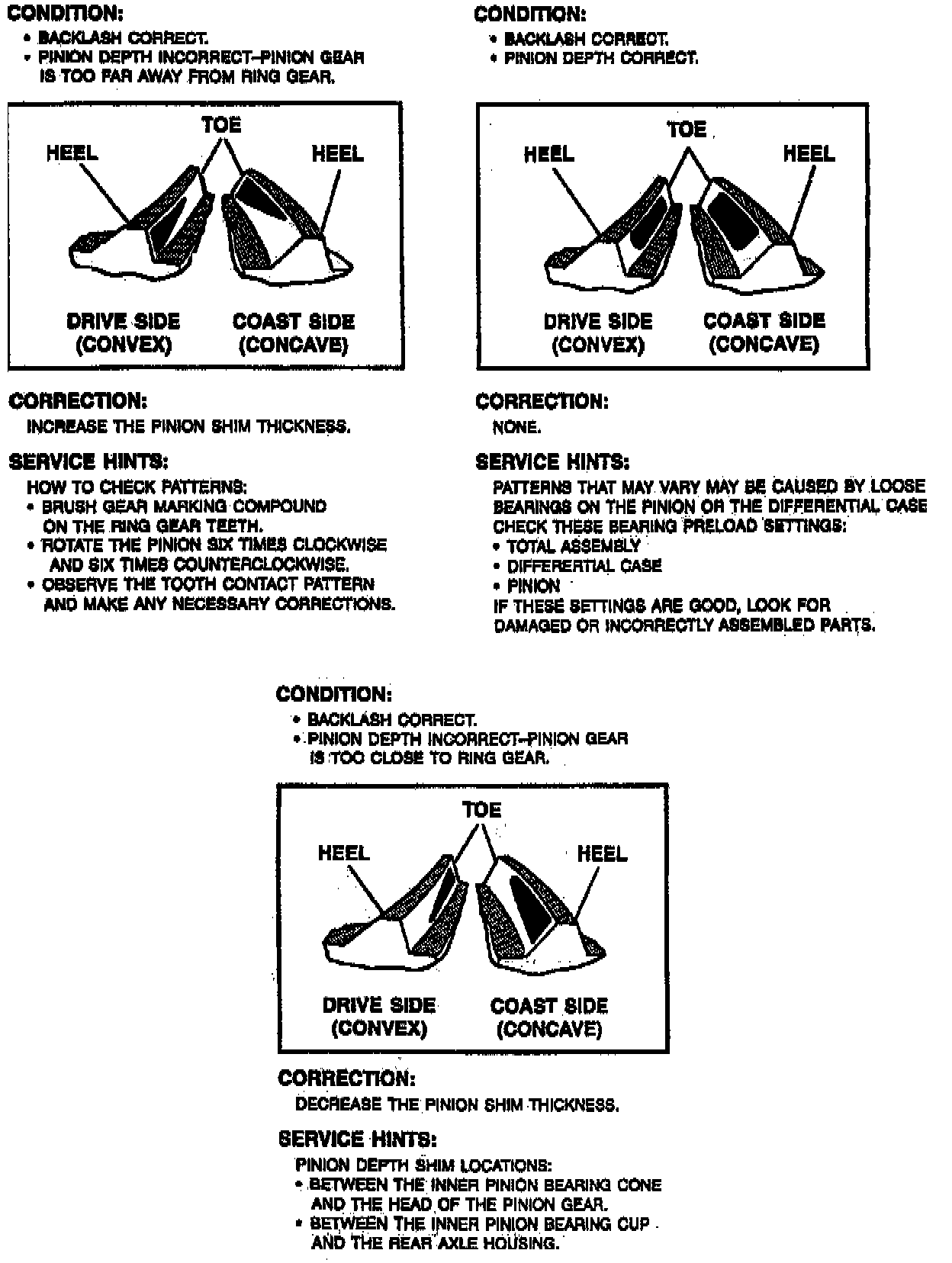 A test made without loading the gears will not give a satisfactory pattern. Turn the pinion flange with a wrench so that the ring gear rotates one full revolution. Then reverse the rotation so that the ring gear rotates one revolution in the opposite direction. Excessive turning of the ring gear is not recommended.