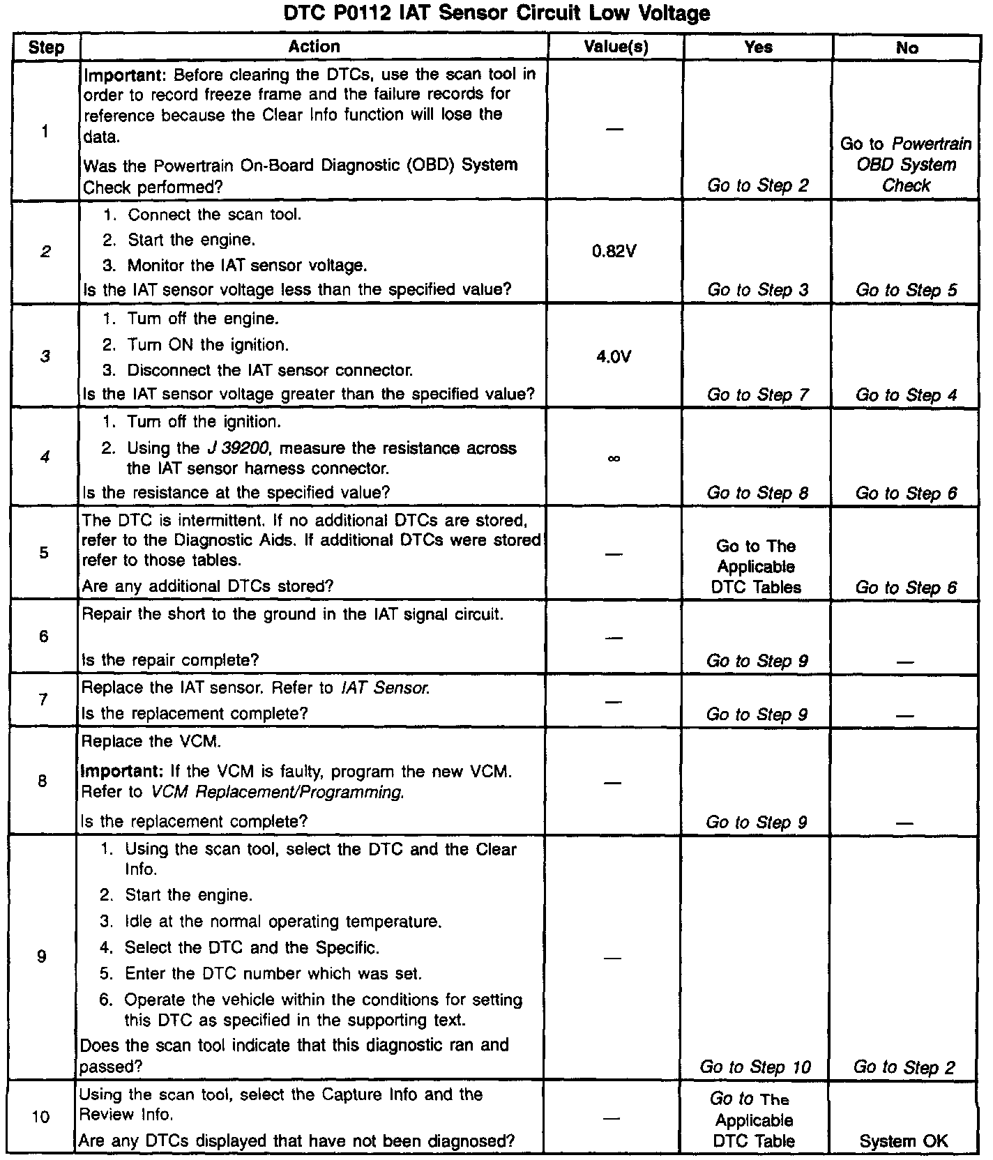 A scan tool indicates the temperature of the ambient air entering the throttle body. The air temperature should read very close to the temperature of the outside air. The air temperature should rise gradually as the engine warms up and the underhood temperature increases. If DTC P1112 is set, the problem is intermittent. Check for a short to ground in the IAT sensor signal circuit. This may be accomplished by moving the VCM harness at various locations and monitoring IAT temperature or IAT voltage on the scan tool. If the voltage varies, look for a short to ground in the area of the harness that caused the waiver. Also, a sensor may become skewed or mis-scaled. The Temperature vs. Resistance Value Table will help to detect a skewed sensor. Refer to Temperature vs Resistance. Specifications