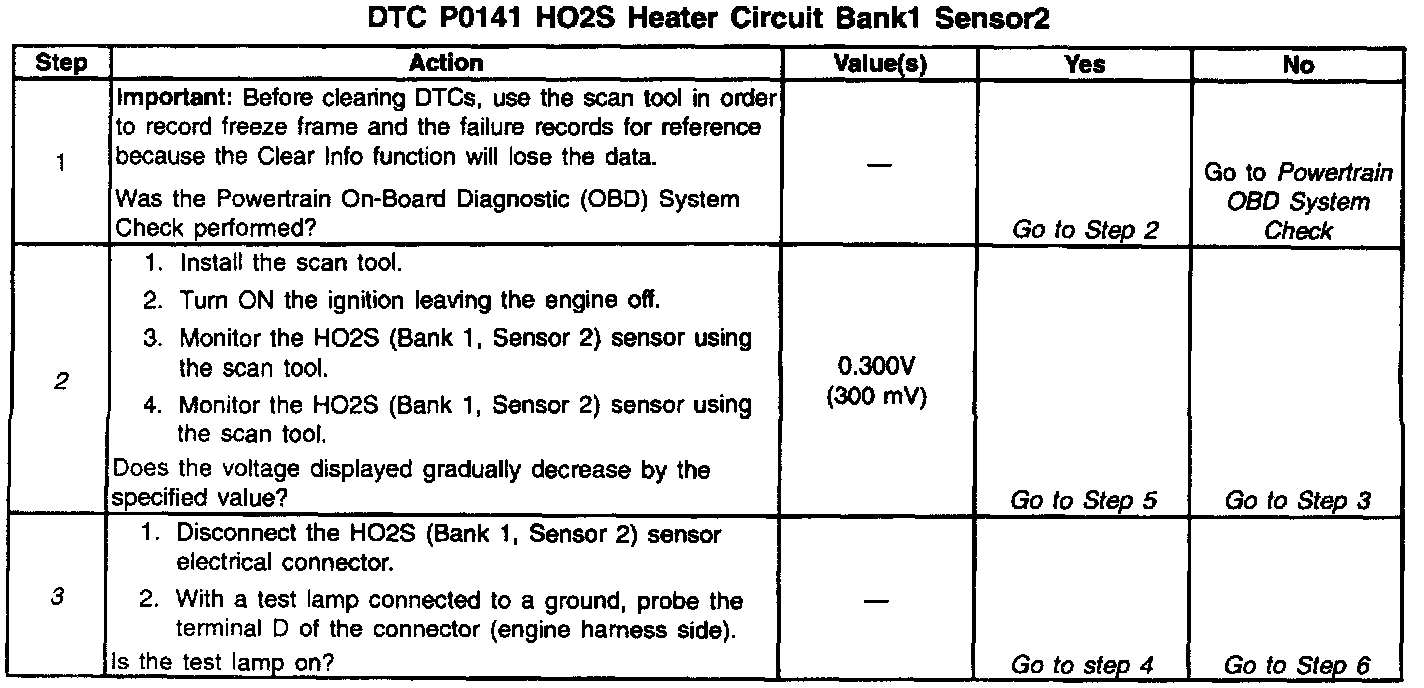 2. This step determines if the DTC P0141 is the result of a hard failure or an intermittent condition. With the ignition switch ON leaving the engine off, the HO2S (Bank 1, Sensor 2) voltage displayed on the scan tool should gradually change to 0.300 volt. This indicates that the heater is working properly. The HO2S voltage can use as high as 975 mV (0.975 volts) before it toggles back down. The main thing to look for is a change.