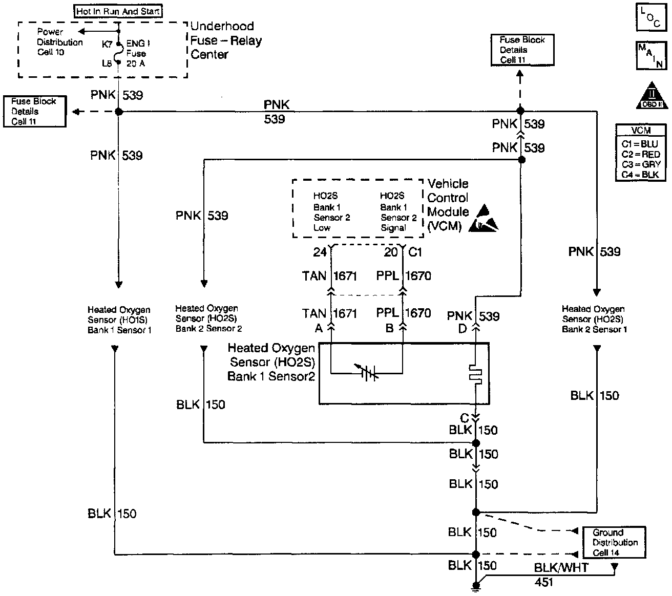The VCM supplies a voltage of approximately 0.45 volt (450 mV) between the HO2S High and the HO2S Low circuits.