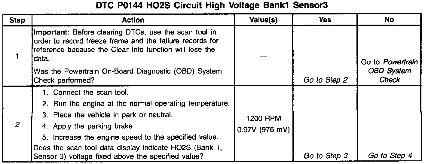 The sensor is like an open circuit and produces no voltage when it is below about 360°C (600°F). The P0144 determines if the HO2S or the circuit is shorted to high by checking for a rich condition during steady throttle and Decel fuel cutoff (DFCO). This DTC is a type B DTC.