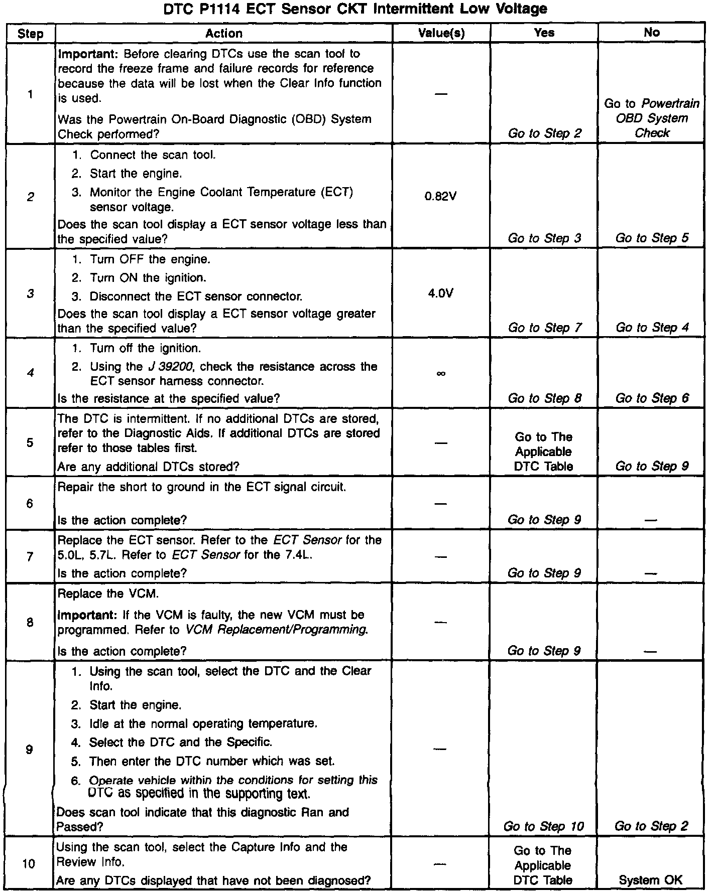 3. This test simulates a DTC P0118. If the VCM recognizes the high signal voltage (high temperature), and the scan tool reads 4.9 volts or above, the VCM and wiring are OK.