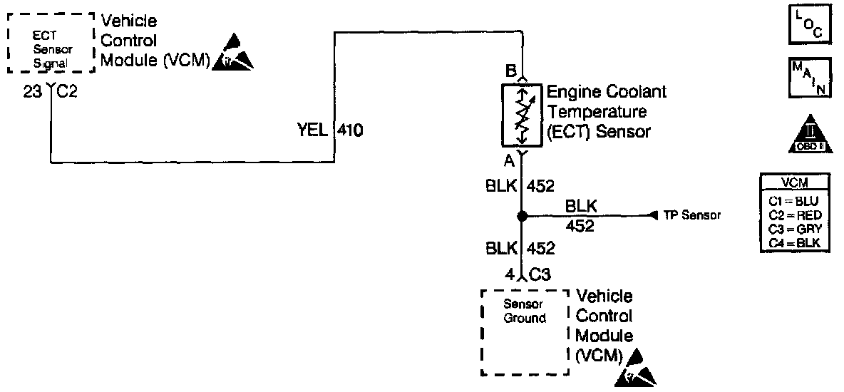 The Engine Coolant Temperature (ECT) sensor is a thermistor which controls the signal voltage to the VCM. The VCM applies a voltage on the 5 volt reference circuit to the sensor. When the engine is cold, the sensor (thermistor) resistance is high; therefore, the VCM senses a high signal voltage, and the VCM indicates the coolant temperature. As the engine warms, the sensor resistance becomes less and the voltage drops indicating the high coolant temperature. At the normal engine operating temperature (85°C to 95°C), the voltage measures about 1.5 to 2.0 volts. This DTC is a type D DTC.