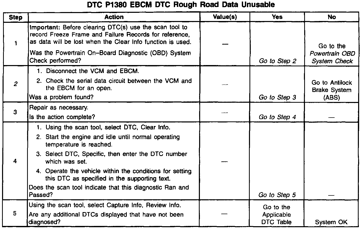 This diagnostic will determine if the ABS system is capable of detecting a rough road situation. DTC P1380 is a type D DTC.