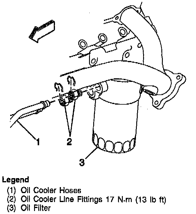 - Tighten the oil cooler line retaining bolt to the oil filter base to 35 Nm (26 ft. lbs.).