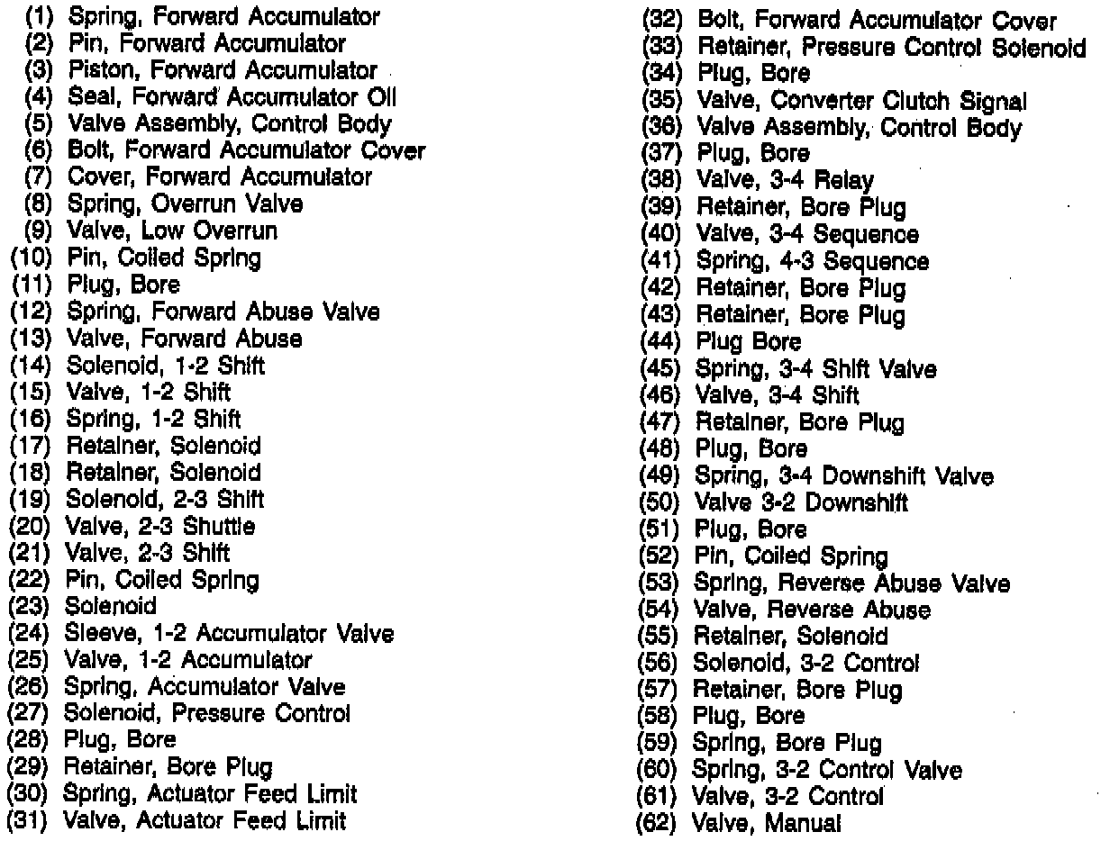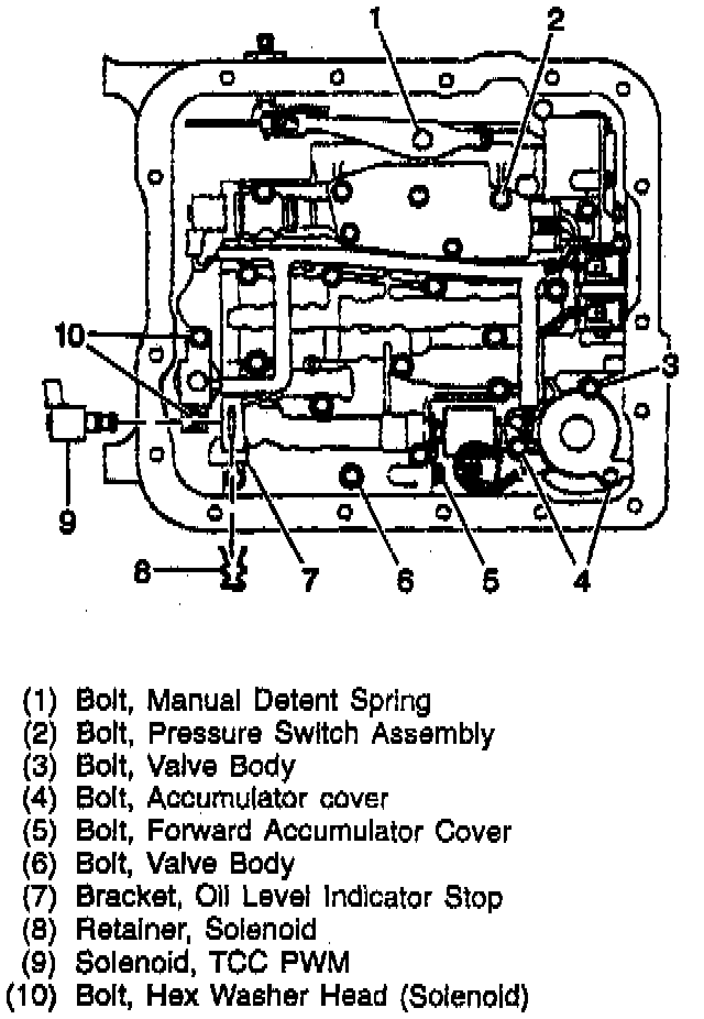 3. Wiring harness, manual spring assembly, pressure switch assembly, and all of the remaining valve body bolts.