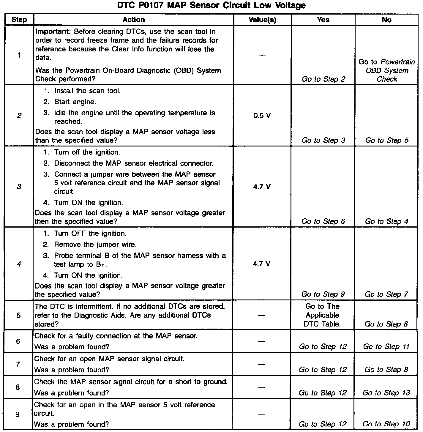 An intermittent open in the MAP sensor signal circuit or the 5 volt reference circuit will result in a DTC P1107.