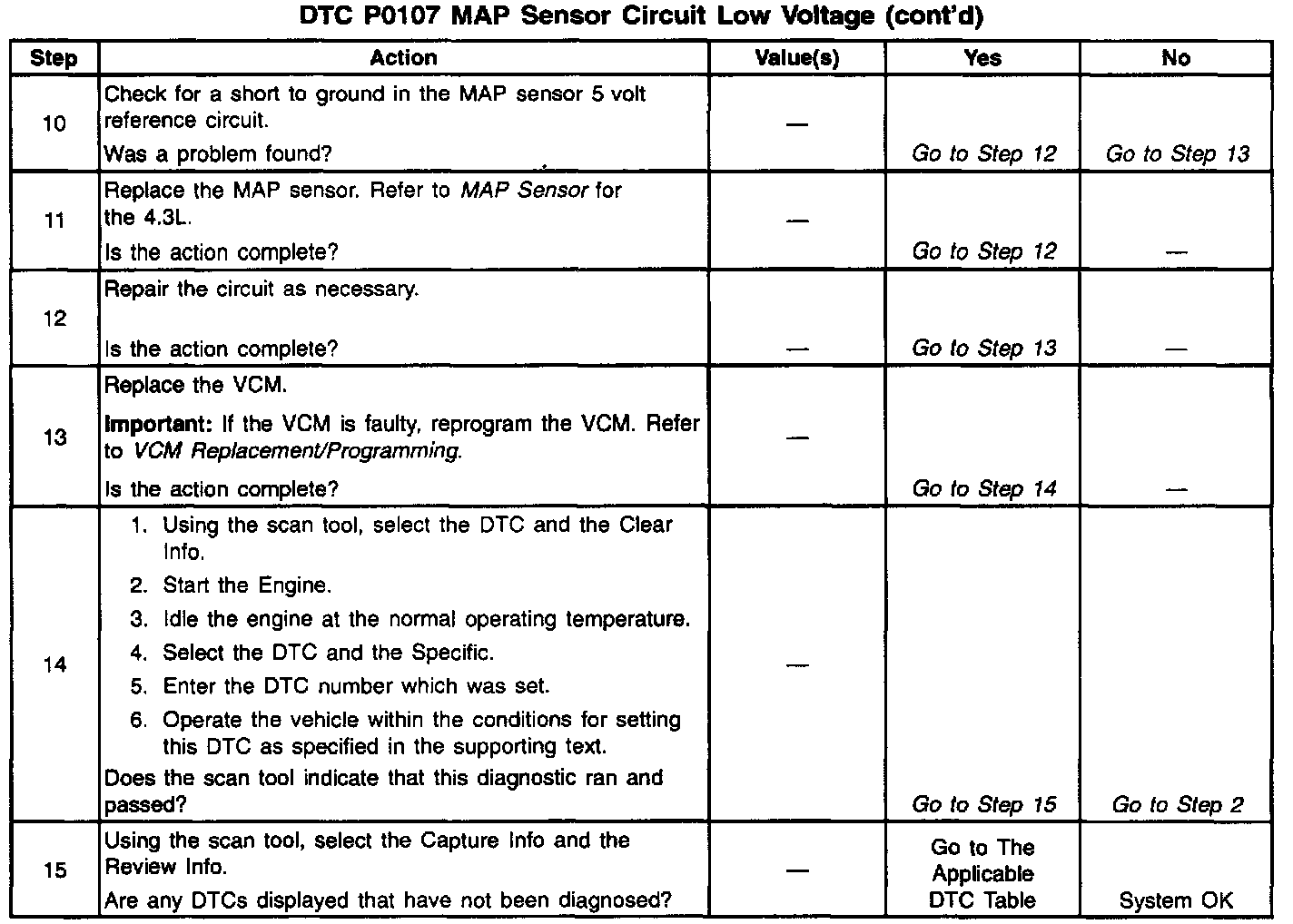The VCM turns on the Malfunction Indicator Lamp (MIL) when the DTC P0107 is reported and 1 failure has occurred. The VCM substitutes a calculated value for the MAP sensor value so acceptable performance is maintained