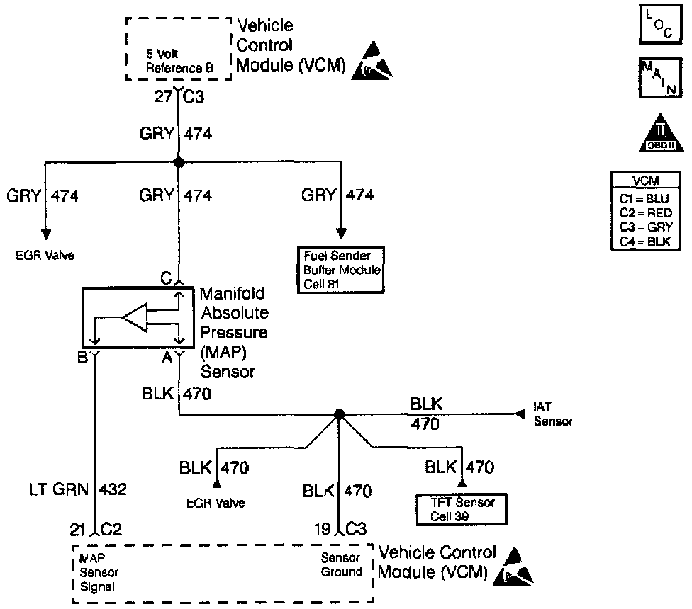 The Manifold Absolute Pressure (MAP) sensor responds to changes in intake manifold pressure (vacuum). A 5 volt reference is applied to the sensor on the 5 volt reference circuit. A variable resistor moves in relation to the manifold pressure and a voltage signal is sent back to the VCM on the MAP signal circuit. This voltage signal varies from 1.0-1.5 volts at closed throttle to 4.0-4.5 volts at wide open throttle (low vacuum). The VCM utilizes the MAP signal and throttle position in order to determine the correct amount of fuel delivered to the engine. This DTC is a type A DTC.