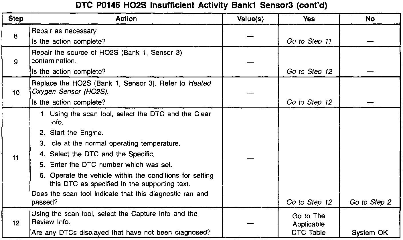 If this voltage is measured using a 10 megohm digital voltmeter, the voltage may read as low as 0.32 volt. The Heated Oxygen Sensor (HO2S) varies the voltage within a range of about 1.0 volt (1000 mV) if the exhaust is rich to as low as 0.10 volt (10 mV) if the exhaust is lean. The VCM monitors the Heated Oxygen Sensor (HO2S) activity for 100 seconds after a Closed Loop. During the monitor period, the VCM counts the number of times that the HO2S switches from rich to lean and from lean to rich and adds the amount of time it took to complete all switches. With this information, an average time for all switches can be determined. If the average time to switch is too slow, a DTC P0146 sets.