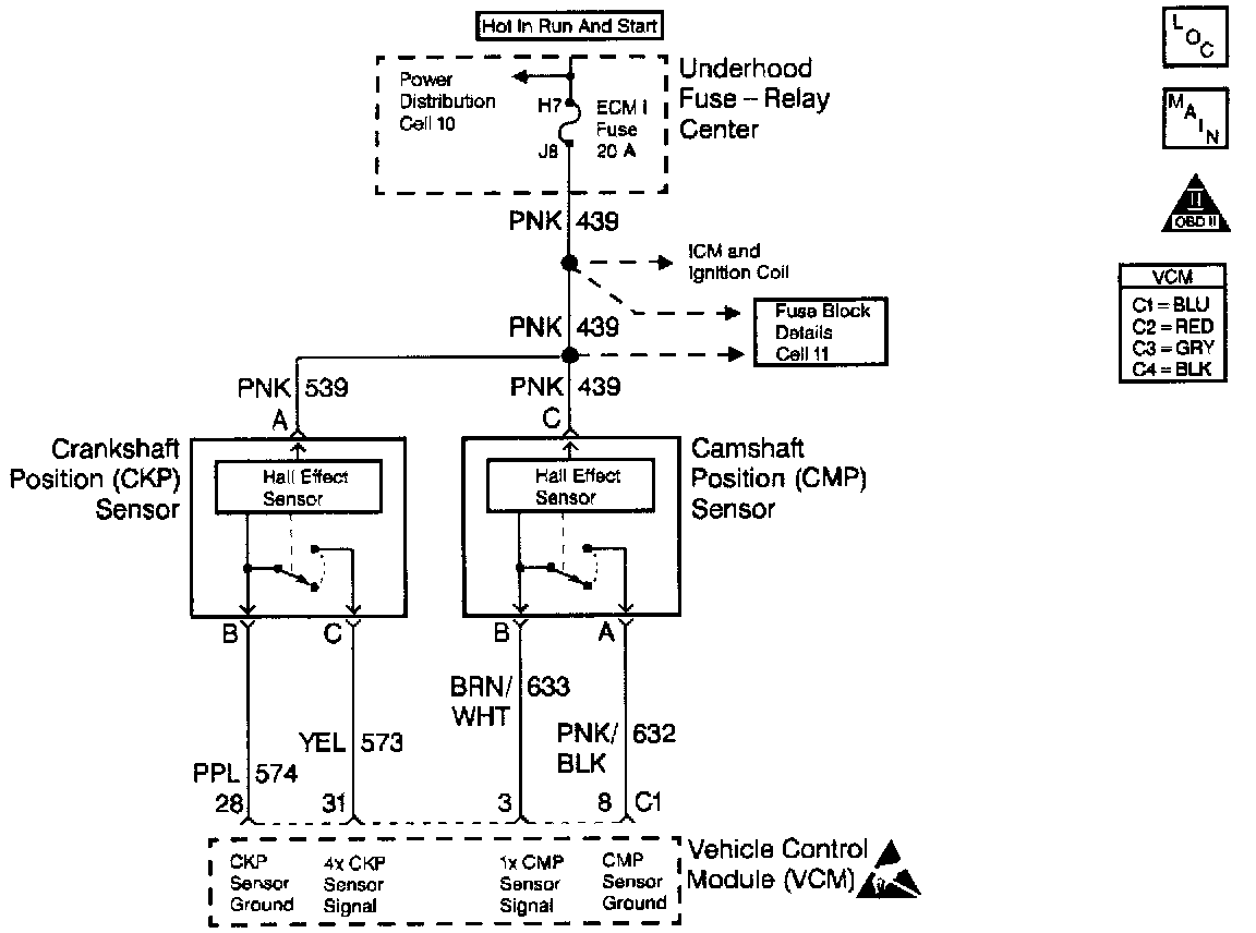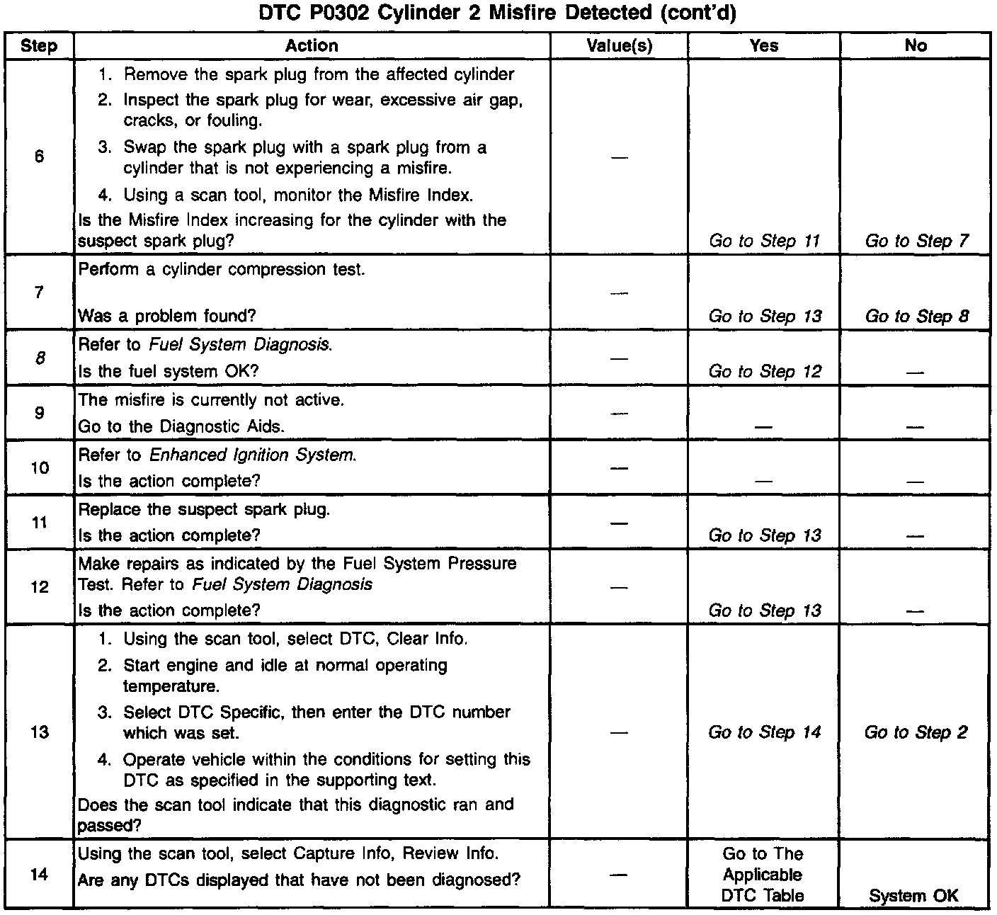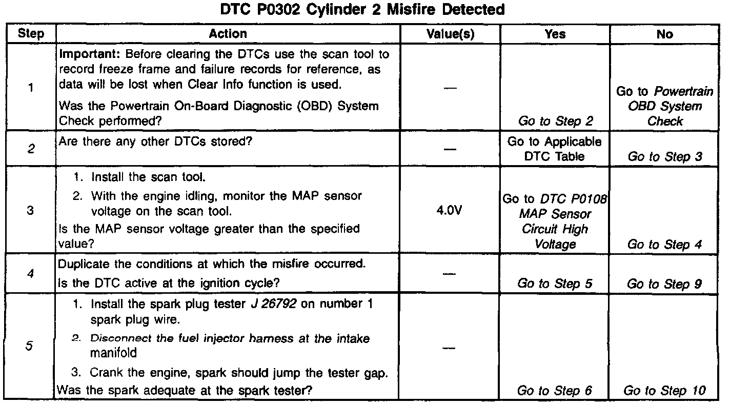 The crankshaft position sensor and camshaft position sensor detects a misfire. The VCM monitors the speed of the crankshaft. The VCM detects a deceleration of the crankshaft that is not associated with normal engine speed reduction. In order to determine if a misfire occurred, the VCM compares the deceleration information to the engine speed and engine load. If a misfire event is determined, the VCM compares the crankshaft position to the cam sensor signal in order to determine which cylinder misfired. The VCM stores the information in separate accumulators for each cylinder. Upon completion (or failure) of the test, the VCM evaluates the number of misfires in each accumulator. If the accumulators are somewhat even or if 3 or more cylinders are misfiring, then this determines that a random misfire has occurred. The VCM also utilizes the input from the ABS wheel speed sensor in order to determine if a rough road condition exists which could cause a crankshaft acceleration and deceleration. If a rough road condition exists, the diagnostic will not run. This DTC is a type B DTC.