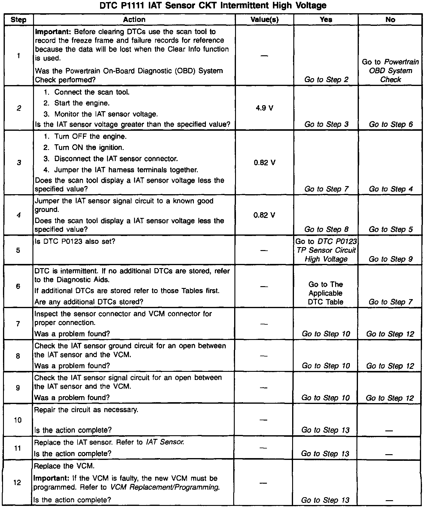 A scan tool indicates the temperature of the ambient air entering the throttle body. The air temperature should read very close to the temperature of the outside air The air temperature should rise gradually as the engine warms up and the underhood temperature increases. If the DTC P1111 is set, the problem is intermittent Check for poor connections at the VCM and IAT sensor by wiggling the connector gently and monitoring the IAT temperature or IAT voltage on the scan tool. If the voltage waivers repair the connector that caused the waiver. Also, a sensor may become skewed or mis-scaled. The Temperature vs. Resistance Value Table will help to detect a skewed sensor Refer to Temperature Vs Resistance. Specifications