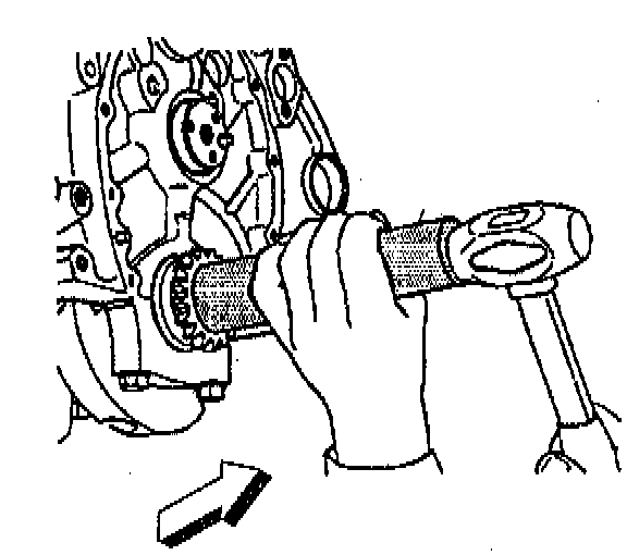 4. Install camshaft sprocket bolts. Be sure to align the camshaft and the crankshaft sprocket alignment marks. Do not attempt to hammer the camshaft sprocket. To do so may dislodge the rear camshaft plug and/or damage the camshaft.