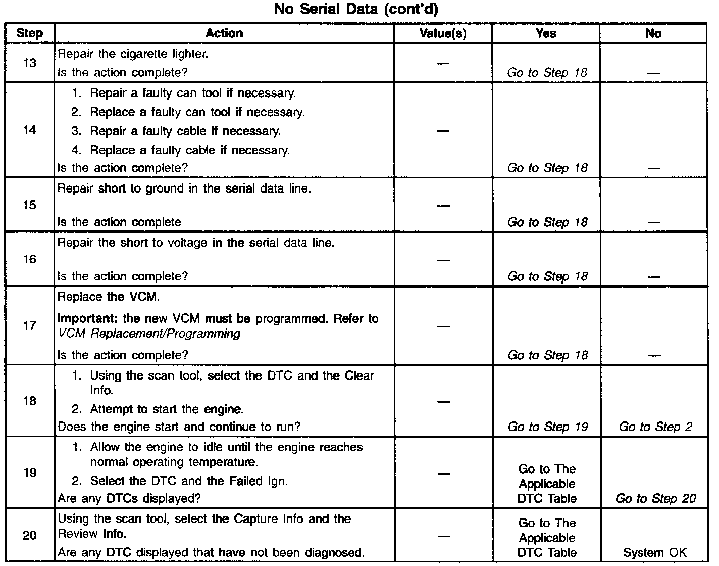 The numbers below refer to the step numbers on the diagnostic table.
