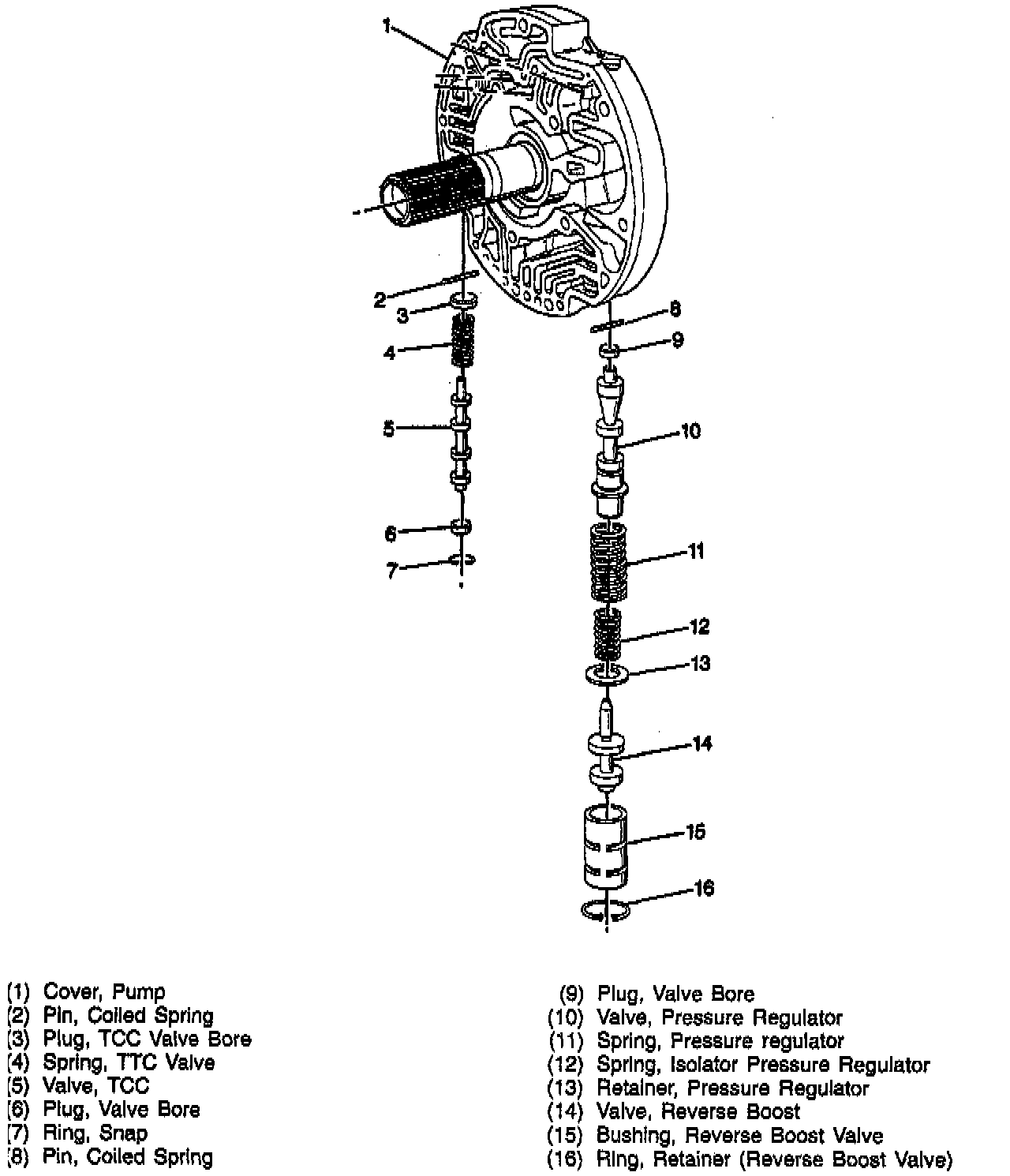2. Retainer ring, reverse boost bushing, reverse boost valve, pressure regulator spring retainer, pressure regulator spring, and the pressure regulator valve.