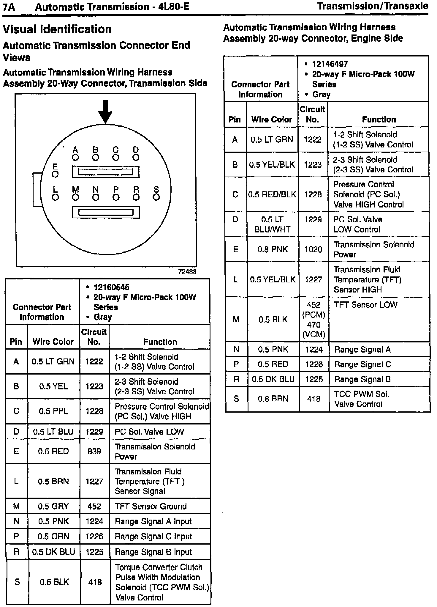 Automatic transmission wiring harness assembly 20-way connector, engine side terminals "L" and "P" wire colors corrected.
