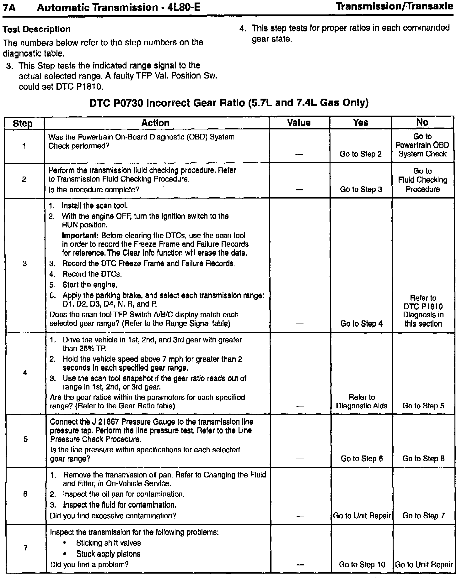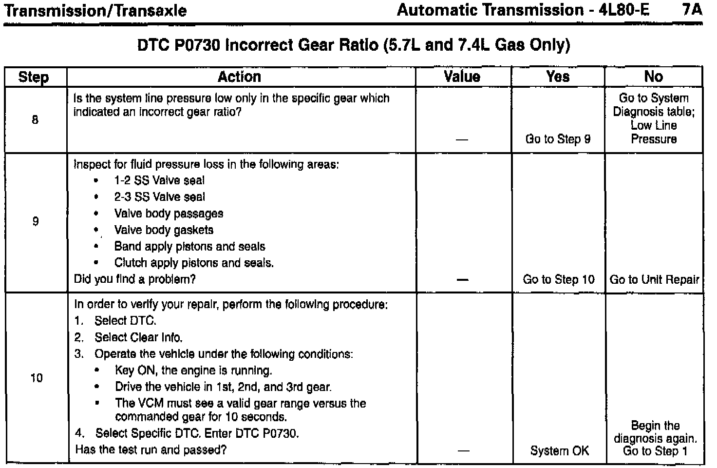DTC P0730 Incorrect Gear Ratio (5.7L and 7.4L Gas) steps 5, 6, 7, 8 and the "Values", "Yes", and "No" columns corrected.