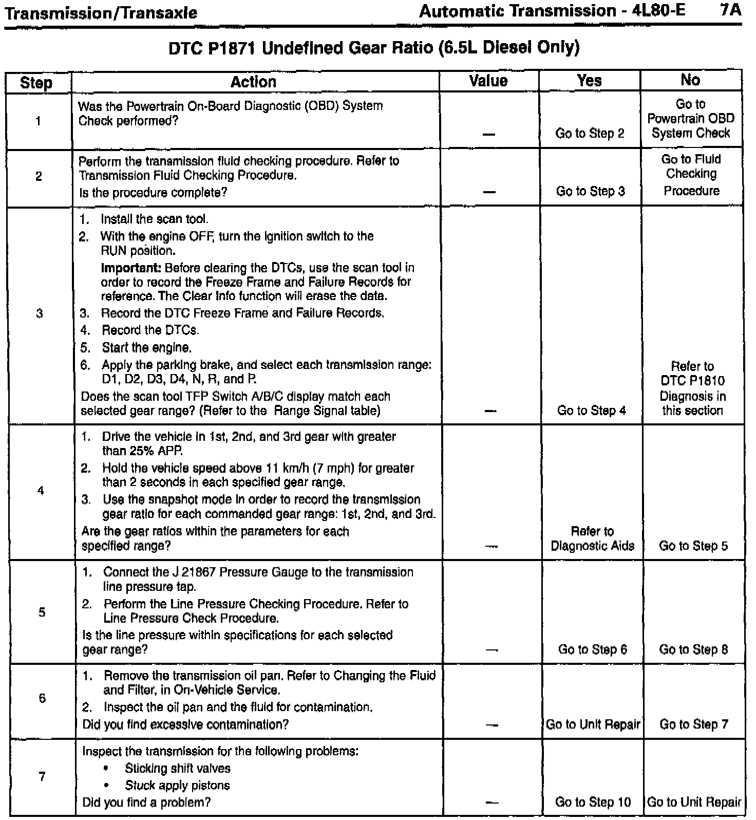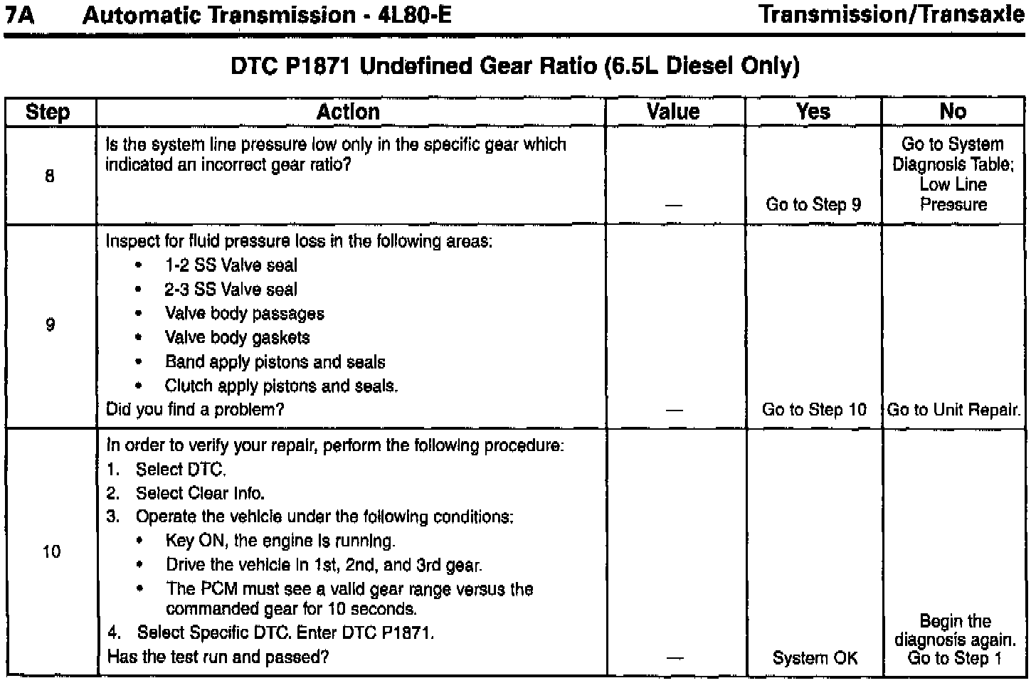 DTC P1871 Undefined Gear Ratio (6.5L Diesel Only) steps 5, 6, 7, 8 and 9 the "Values", "Yes", and "No" columns corrected.