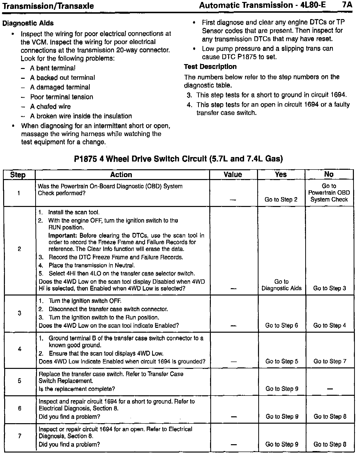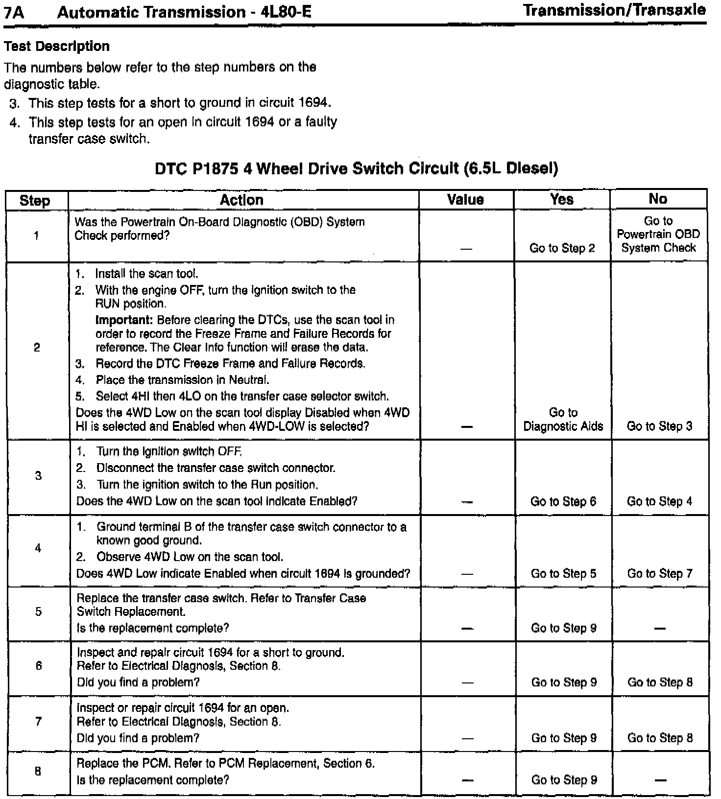 DTC P1875 4 Wheel Drive Switch Circuit (6.5L Diesel) and (5.7L and 7.4L Gas) steps 2, 3 and 4 "Action" column corrected.
