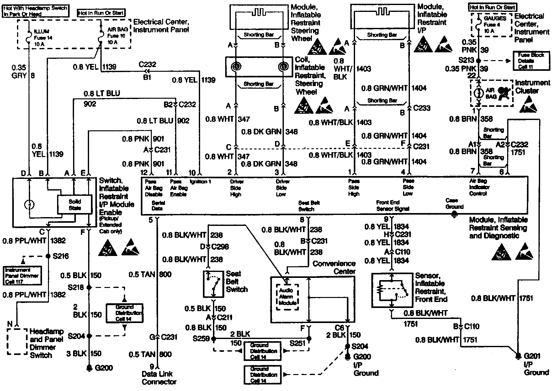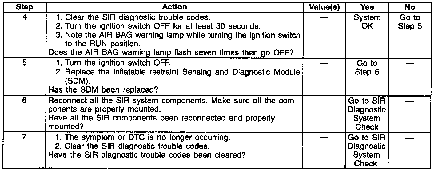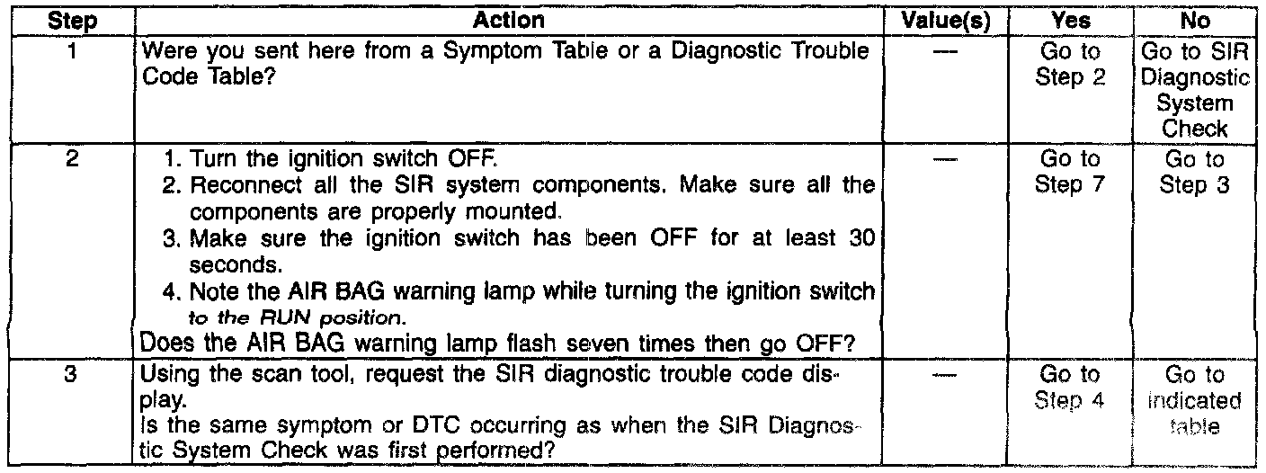 This table assumes that the SIR Diagnostic System Check and either a symptom table or a diagnostic trouble code table diagnosis has been performed. When all circuitry outside the inflatable restraint Sensing and Diagnostic Module (SDM) has been found to operate properly, as indicated by the appropriate diagnostic table, and the symptom or DTC remains current, the following diagnostic procedures must be performed to verify the need for SDM replacement.