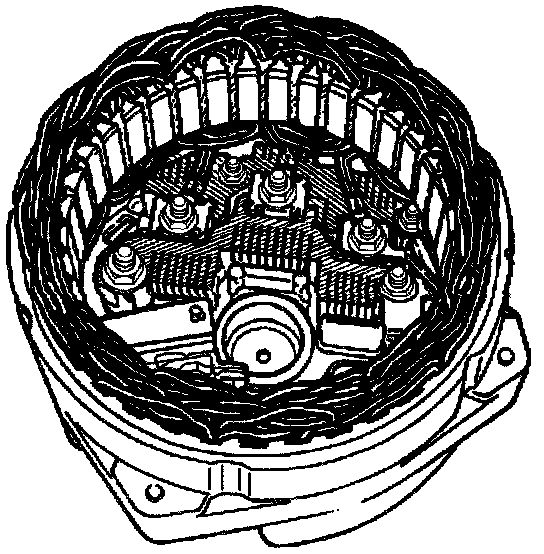 11. Stator into the end frame, aligning the three stator leads to the three rectifier bridge terminals.