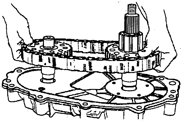 18. Mainshaft and oil pump assembly into the carrier assembly. Hub fits in one orientation with the mainshaft.