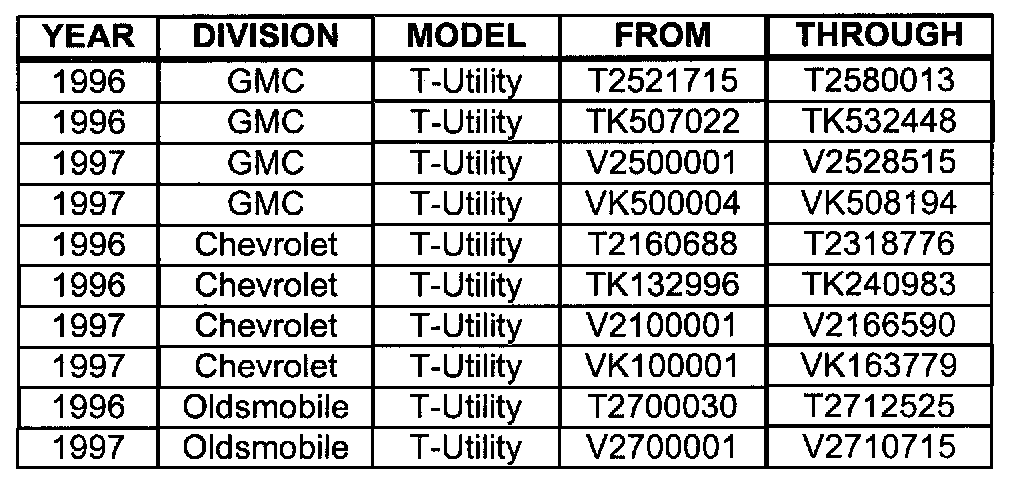Involved are certain 1996-1997 Chevrolet Blazers, GMC Jimmys, and Oldsmobile Bravadas built within the VIN breakpoints shown.