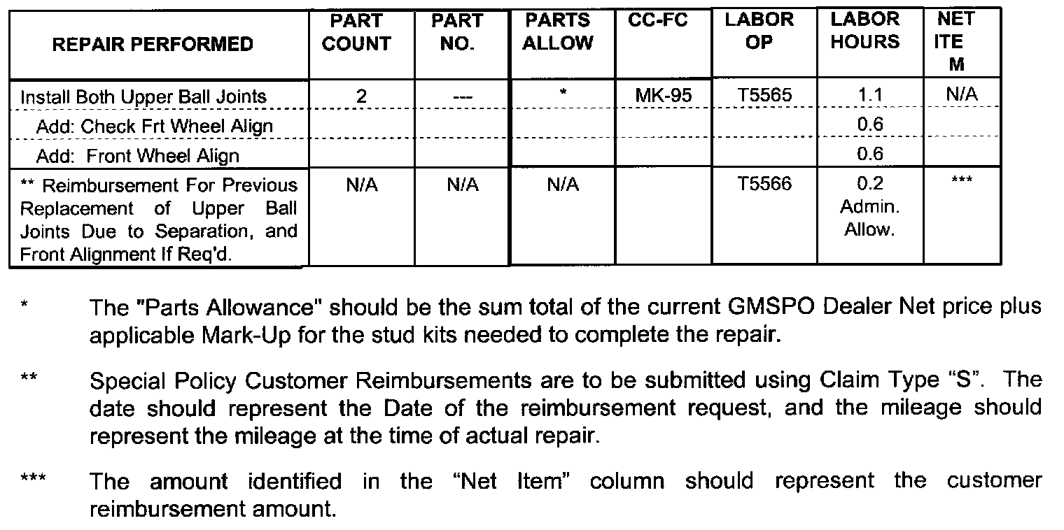 Customer requests for reimbursement of previously paid repairs to replace the upper ball joints due to separation are to be submitted prior to or by November 30, 2002 (this time limitation may be longer depending upon the law in your state). Repairs must have occurred within the eight (8) years of the date the vehicle was originally placed in service, or 100,000 miles (161,000 km), whichever occurs first.