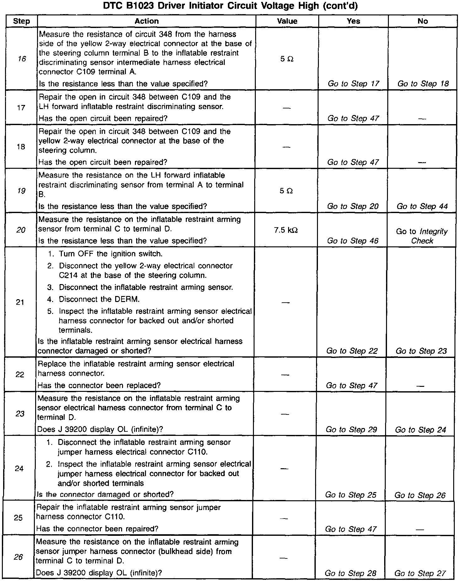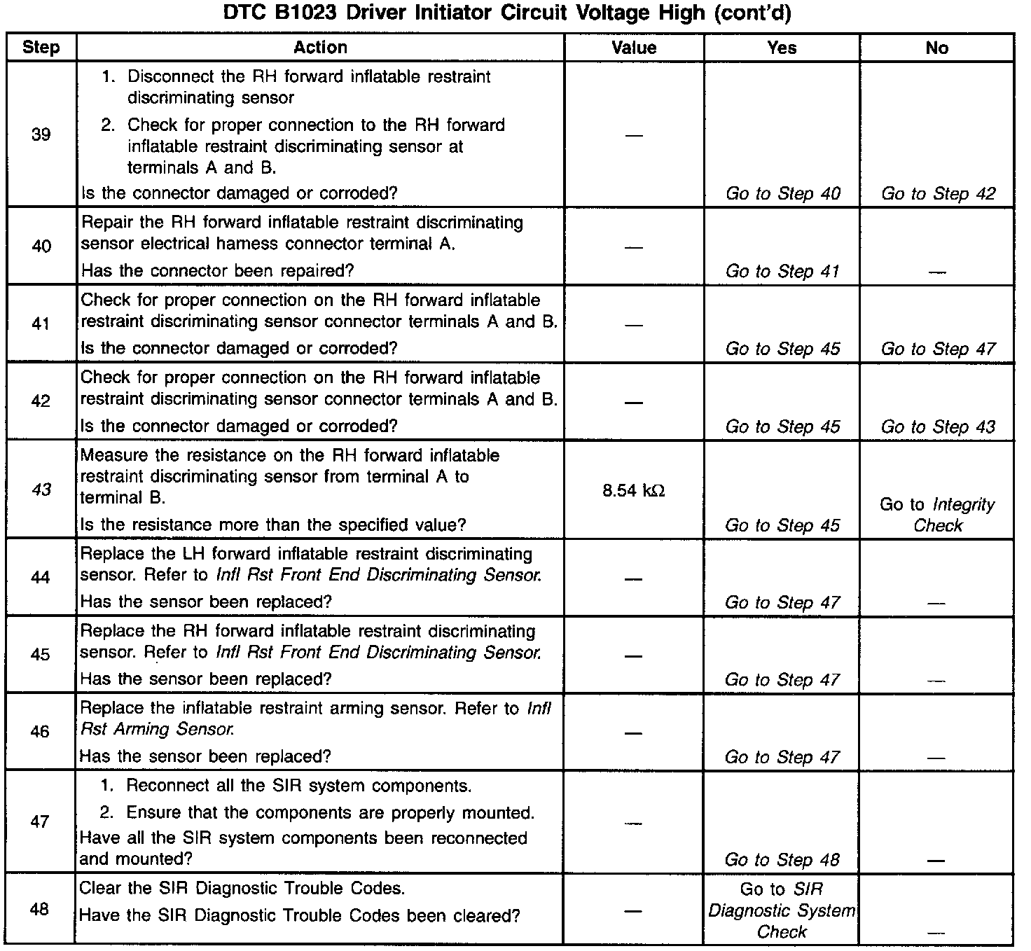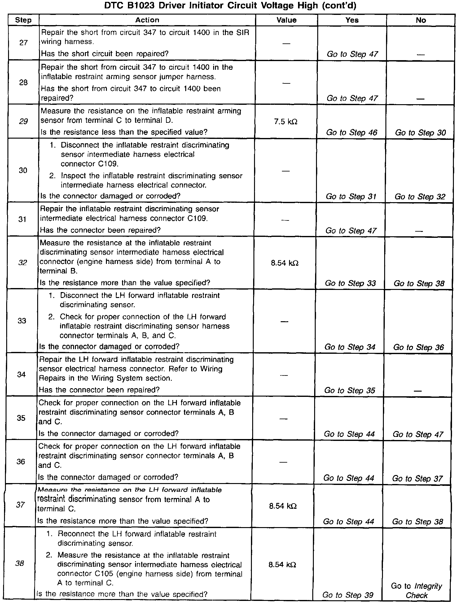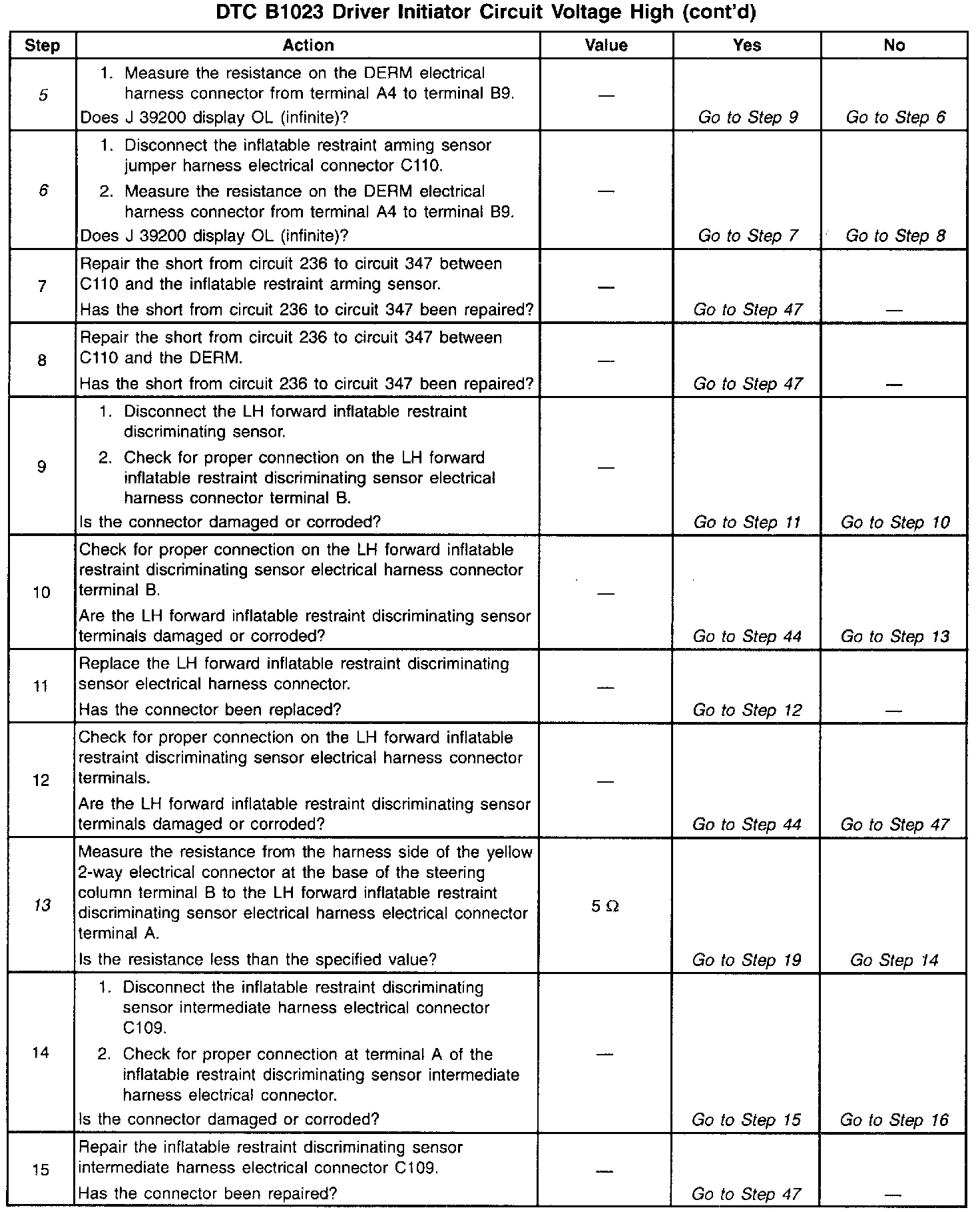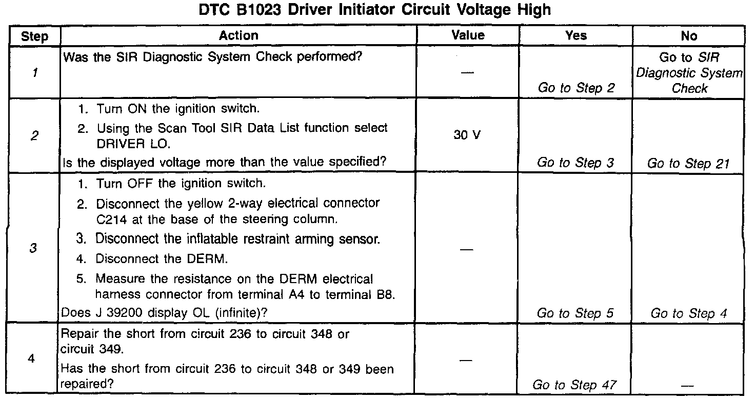 During normal, non-deployment operation of the SIR system, a small amount of current flows through the driver deployment loop. The diagnostic resistors within the inflatable restraint arming sensor and the inflatable restraint discriminating sensors along with the resistance of the inflatable restraint steering wheel inflator module causes voltage drops within the deployment loop. The inflatable restraint Diagnostic Energy Reserve Module (DERM) monitors the voltage at the Driver Side Low terminal B8 to detect shorts or opens within the driver deployment loop. When the voltage measures above a specified percentage of the Driver 36 VLR for 500 milliseconds, the DERM sets the DTC B1023.