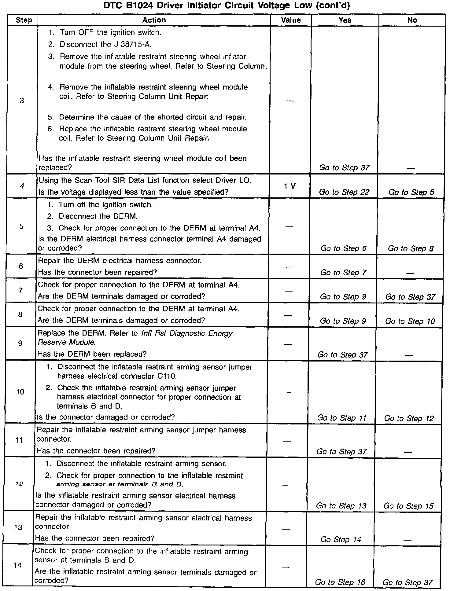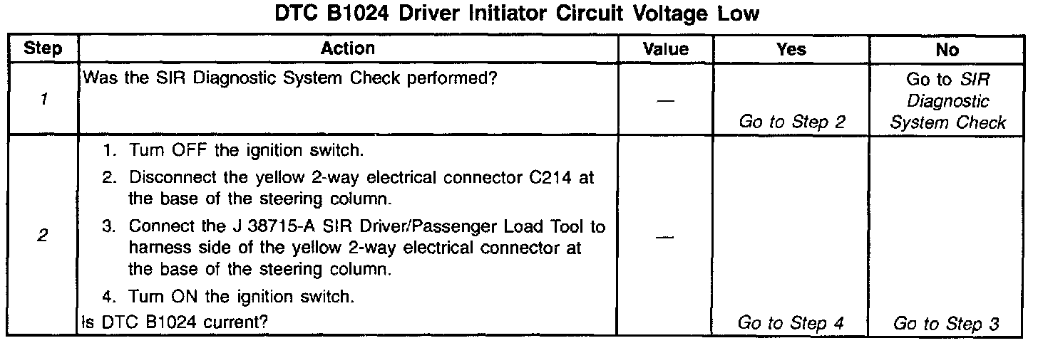 During normal, non-deployment operation of the SIR system, a small amount of current flows through the driver deployment loop. The diagnostic resistors within the inflatable restraint arming sensor and the inflatable restraint discriminating sensors, along with the resistance of the inflatable restraint steering wheel inflator module cause voltage drops within the deployment loop. The inflatable restraint Diagnostic Energy Reserve Module (DERM) monitors the voltage at the Driver Side Low terminal B8 to detect shorts or opens within the deployment loop. DTC B1024 sets when the DERM measures the voltage at terminal B8 below a specified percentage of Driver 36 VLR for 500 milliseconds.