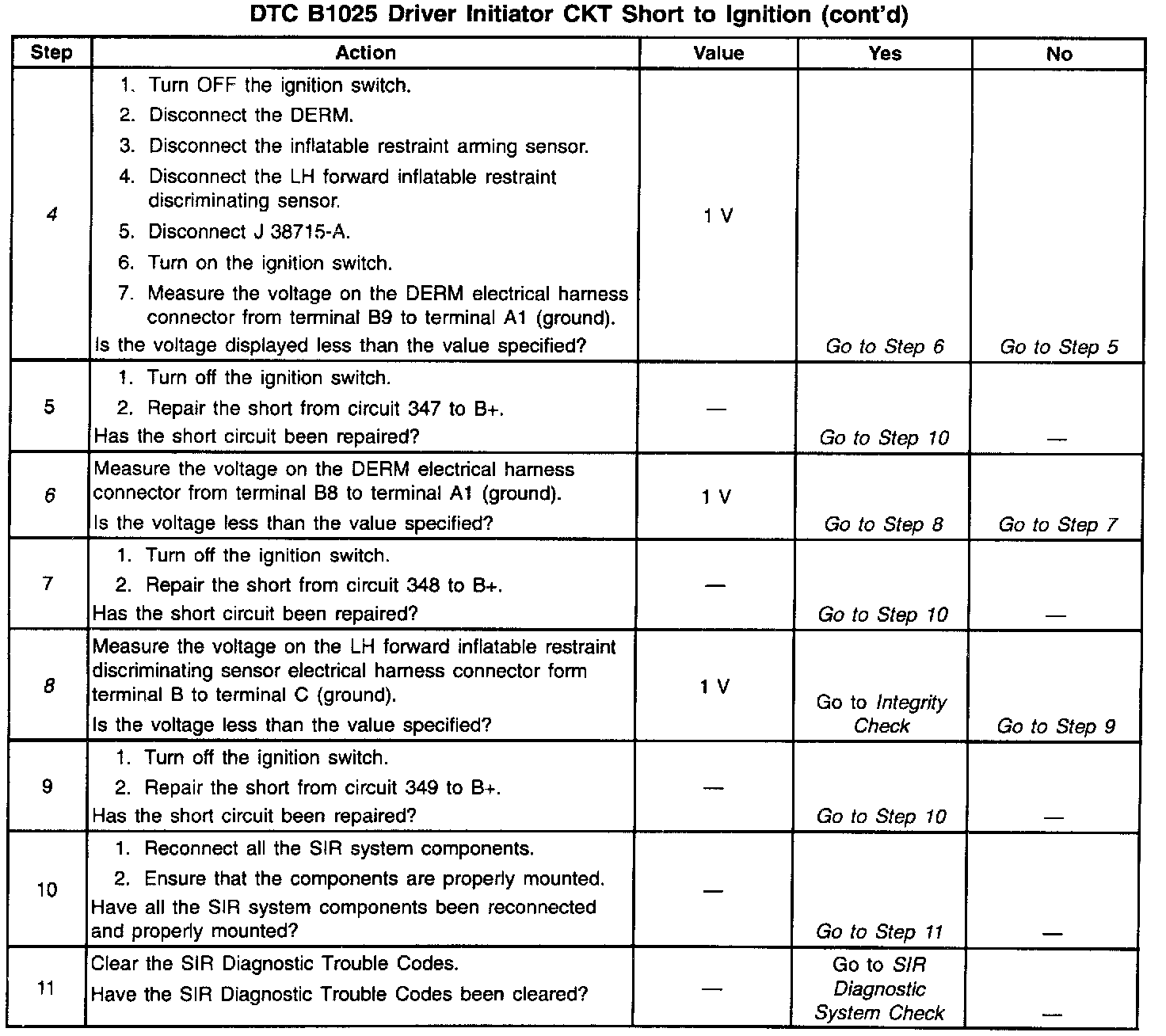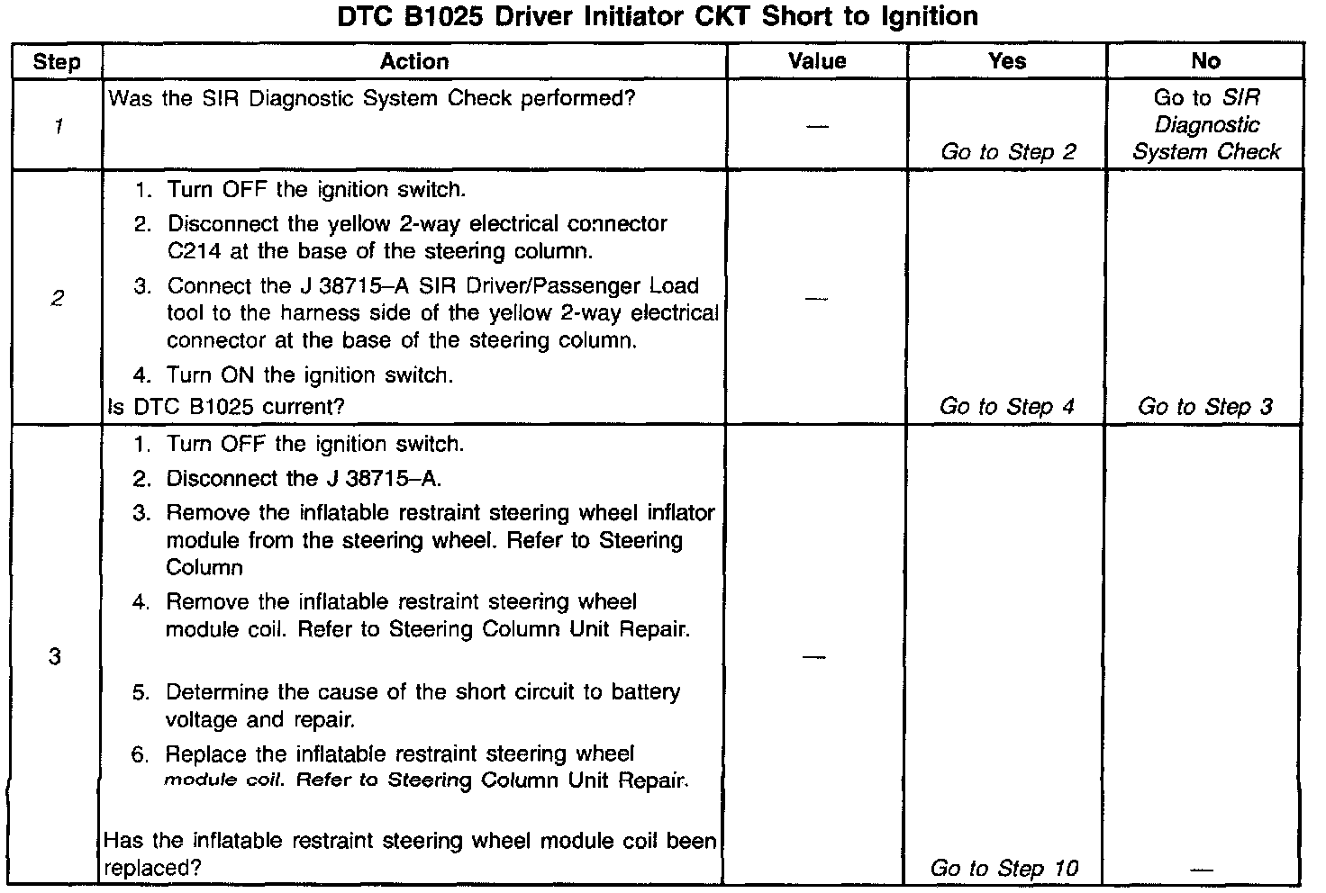 This diagnostic trouble code can only be set when the malfunction is present as the ignition switch is turned on. After the Initiator Assembly Resistance test is completed, a short to B+ in the steering column, CKT 347, CKT 348, or CKT 349 causes the DTC B1024 to set. When a scan tool issues a Clear Codes command and the malfunction remains, the DTC will not reappear for ten minutes or until the next ignition cycle.