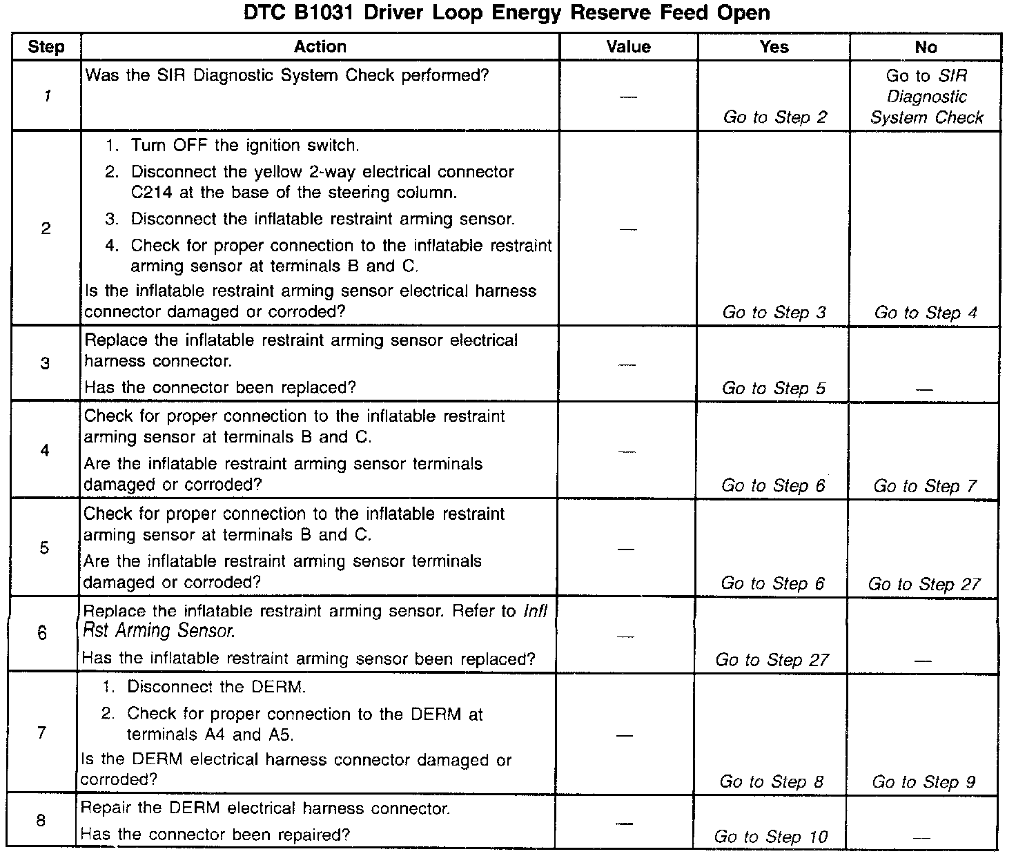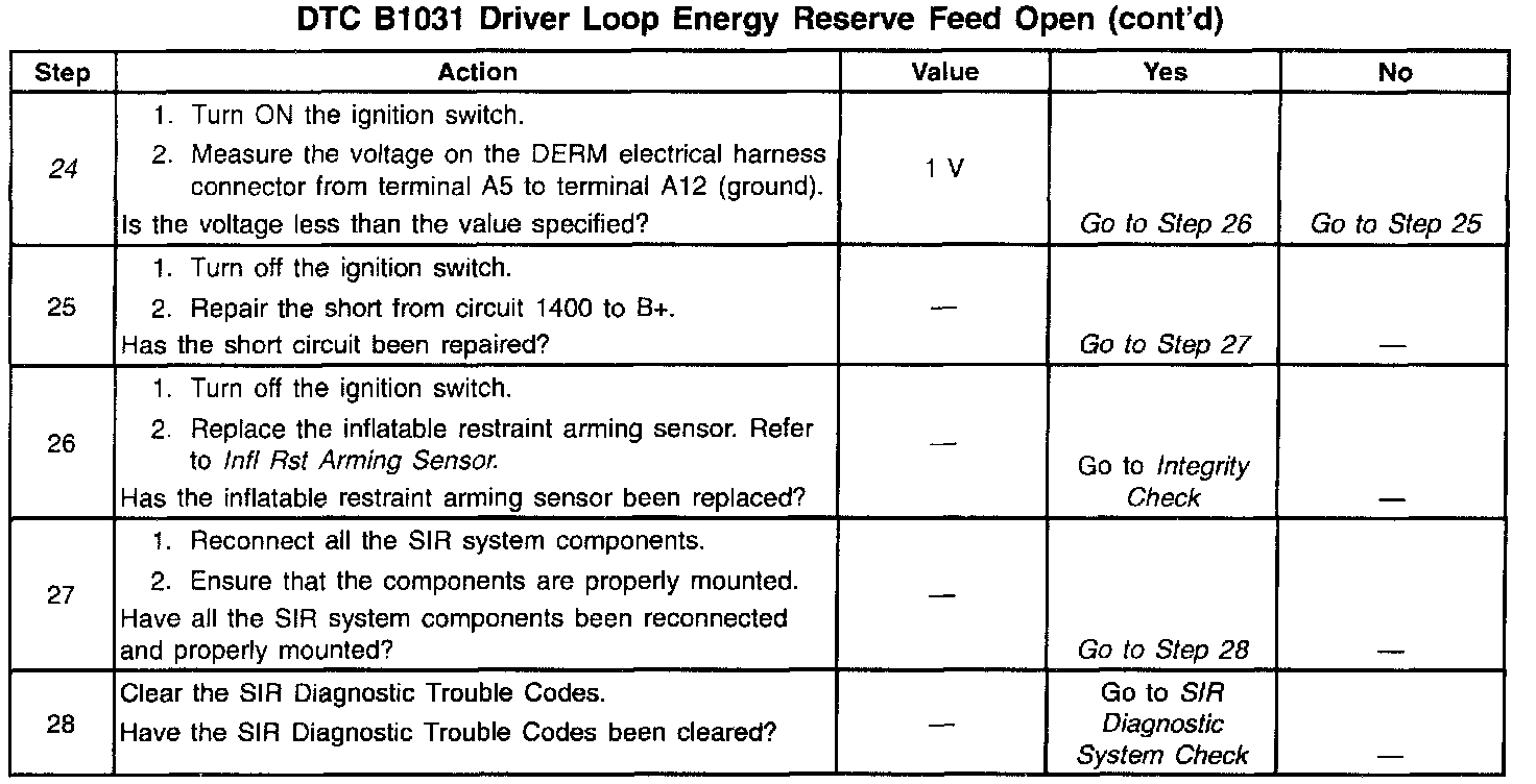 18. This test checks for high resistance, but not an open, in the Driver Source Sense circuit between the DERM and inflatable restraint arming sensor electrical harness connector.