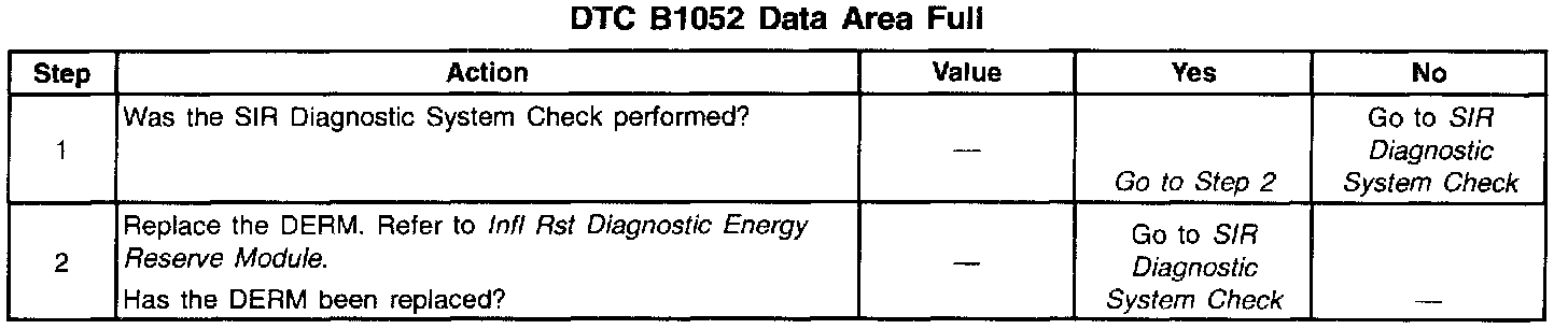 The DTC clears when the DERM receives a scan tool Clear Codes command. If, at the next ignition ON after receiving a Clear Codes command, the DERM detects the data area is full, it sets a history diagnostic trouble code. This allows the AIR BAG warning lamp to illuminate should the DERM detect any additional malfunctions.