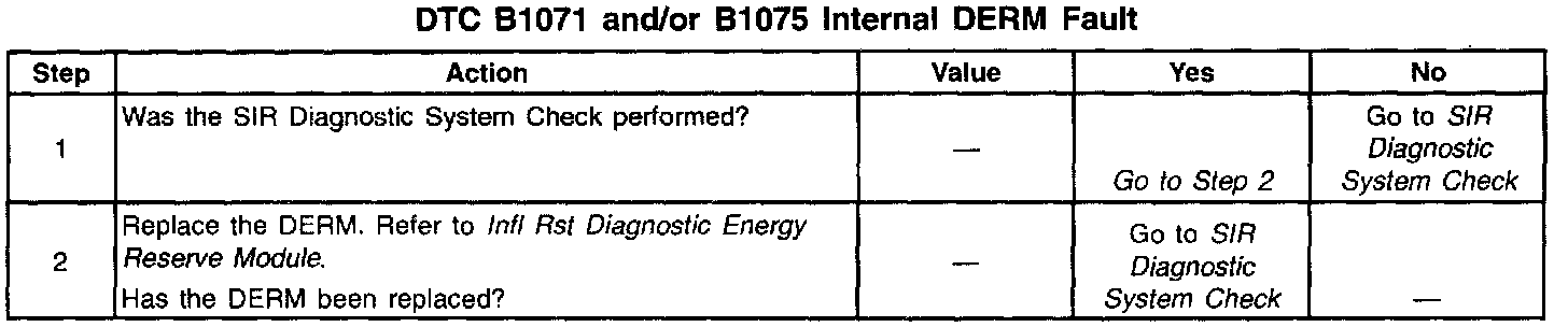 DTC B1071 and/or B1075 indicates an internal inflatable restraint Diagnostic Energy Reserve Module (DERM) malfunction and sets when the DERM detects any of the following conditions: