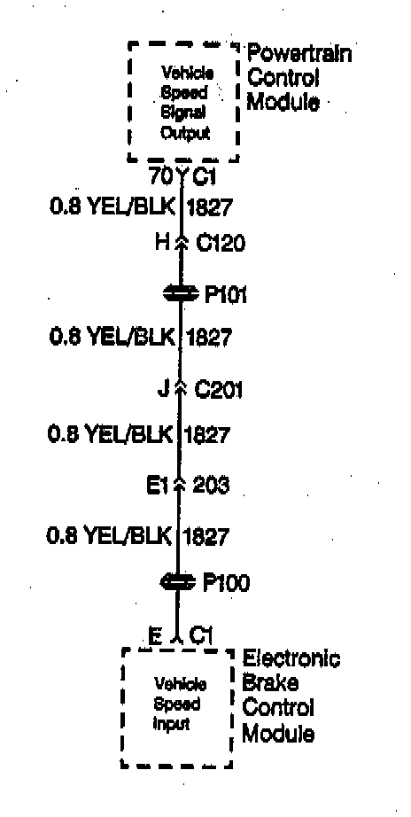 The rear wheel speed signal originates from the Vehicle Speed Sensor (VSS) which is connected to the Powertrain Control Module Vehicle Control Module (PCM). The Electronic Brake Control Module (EBCM) receives the rear wheel speed signal from the VCM.