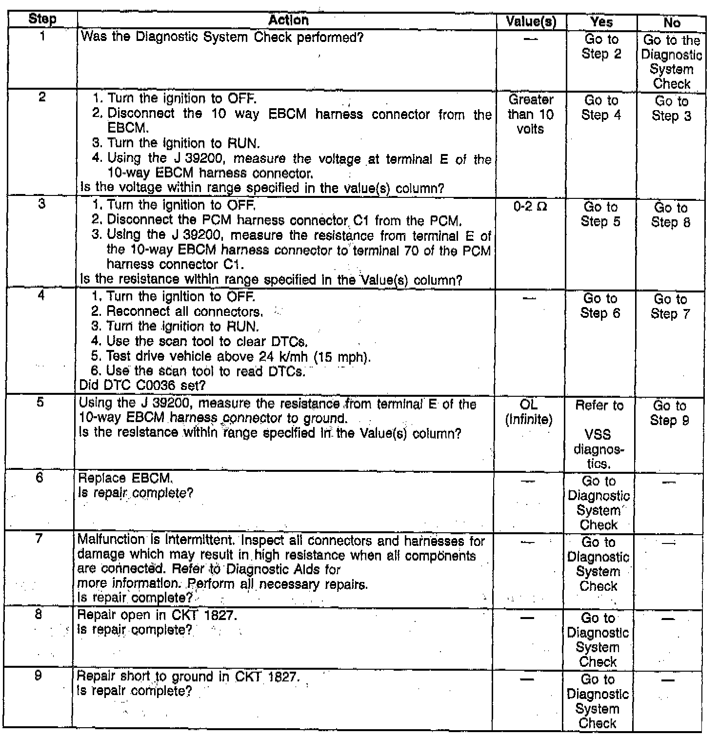 EBCM losing the rear wheel speed signal for at least 5 seconds at speeds over 13 km/h (8 mph) with the brake pedal released. If a Diagnostic Trouble Codes (DTC) C0035 is also stored, use that diagnostic chart.