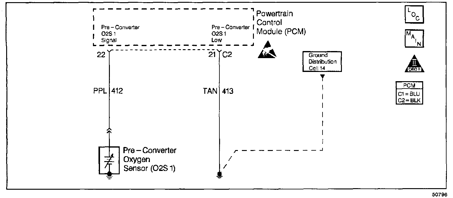 The Powertrain Control Module (PCM) supplies a voltage of about 0.45 volts to the Oxygen Sensor 1 (O2S 1). The O2S 1 varies the voltage between a range of about 1 volt if the exhaust is rich, down through about 0.10 volt if the exhaust is lean.