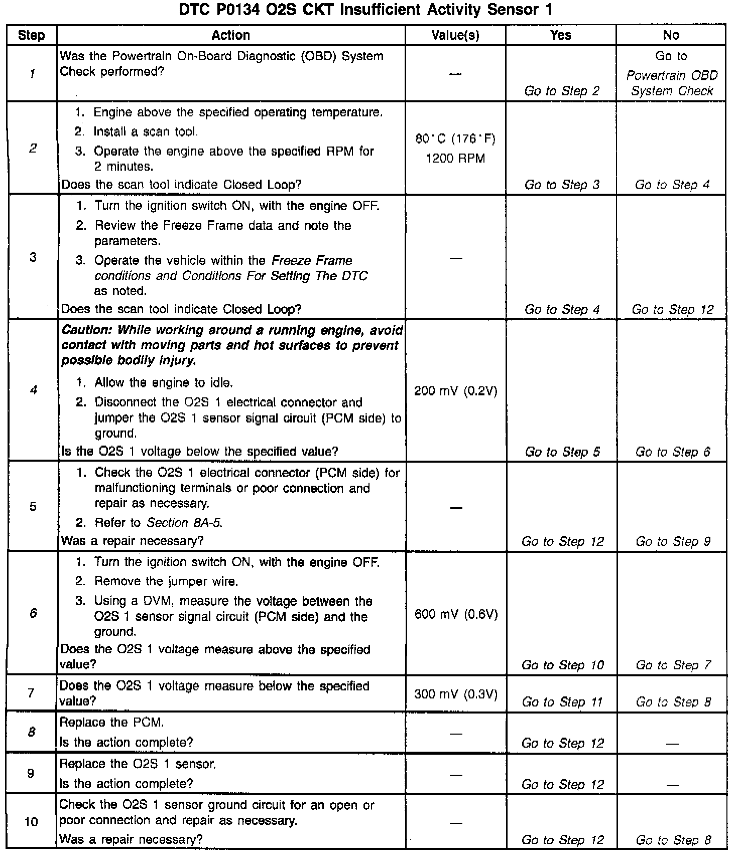 2. During engine warm-up, the O2S 1 should warm-up and its voltage output should vary between 150 mV and 850 mV. When O2S 1 voltage varies, the engine will go into Closed Loop. This step determines if the O2S 1 is operating properly.