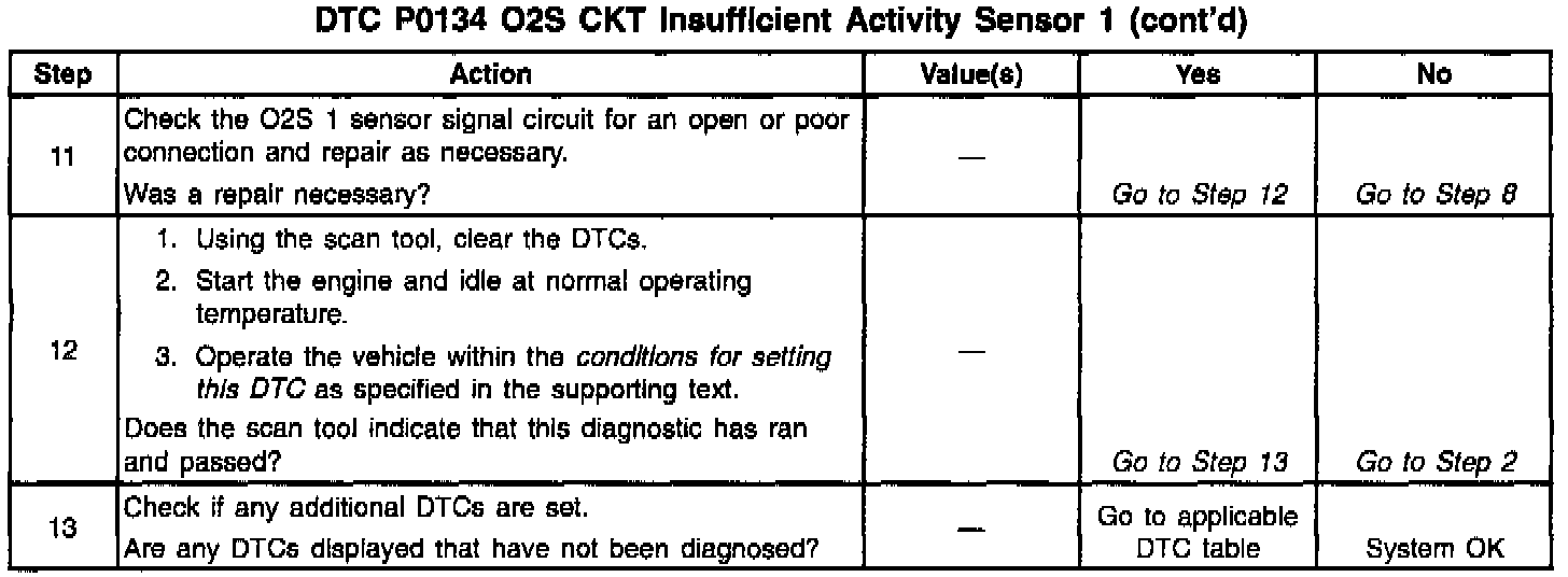 ^ The normal scan tool voltage varies between 150 mV to 850 mV (0.15 volt to 0.85 volt) when in a Closed Loop. The DTC P0134 sets in approximately 88 seconds when the voltage remains between 0.407 volt and 0.509 volt. The system will go into an Open Loop in about 30 seconds.