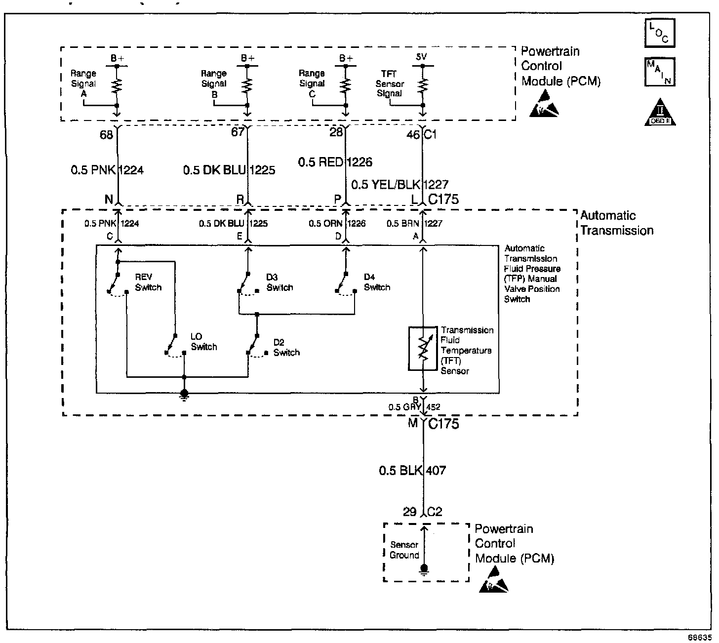The Automatic Transmission Fluid Temperature (TFT) sensor is a thermistor within the Automatic Transmission Fluid Pressure Manual Valve Position Switch (TFP Val. Position Sw.). The TFT sensor controls the signal voltage to the PCM. The PCM supplies a 5-volt reference to the sensor on circuit 1227. When the transmission fluid is cold, the sensor resistance is high. The PCM detects high signal voltage. As the transmission fluid temperature increases to a normal operating temperature, the sensor resistance becomes less and the signal voltage decreases.