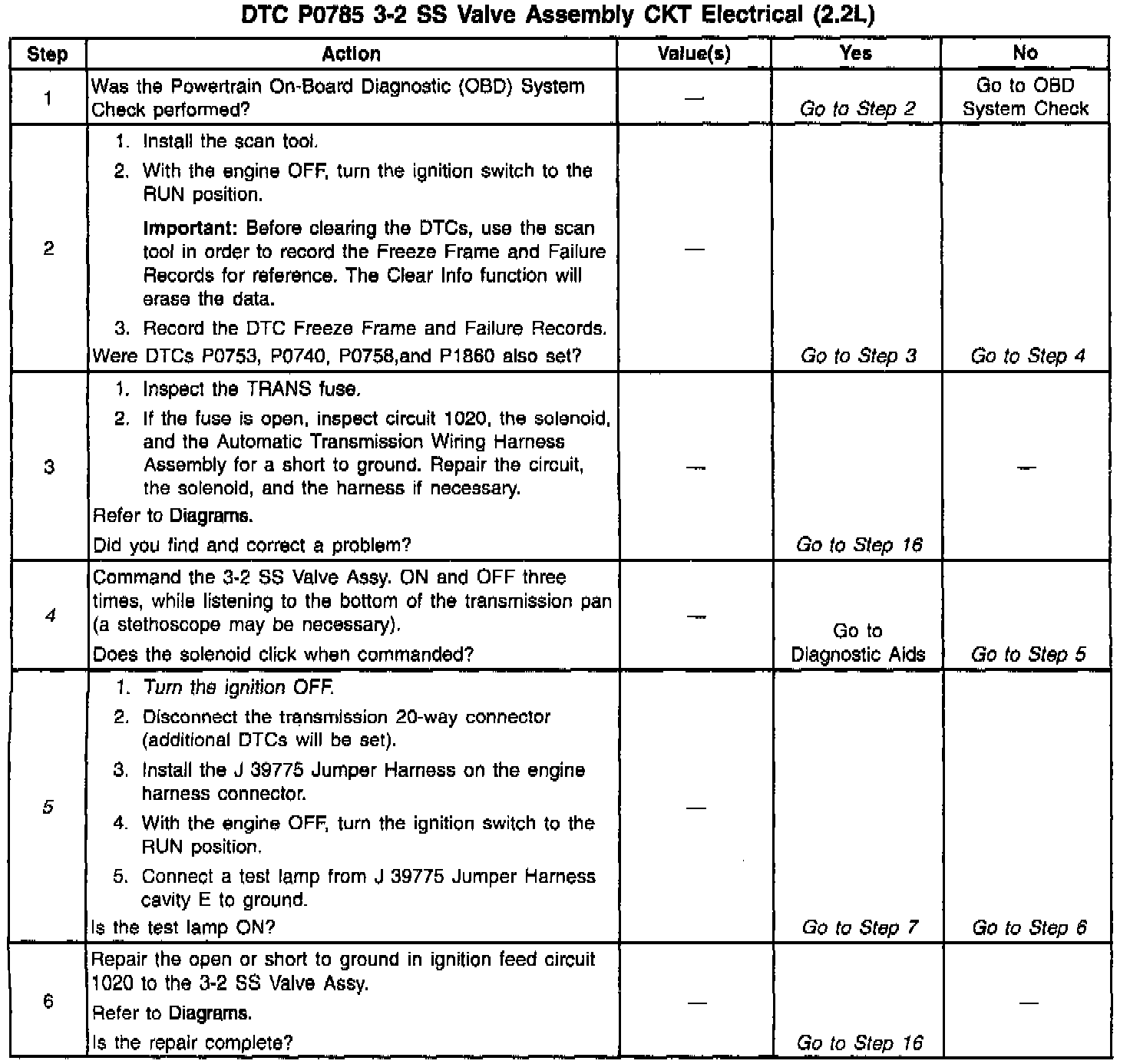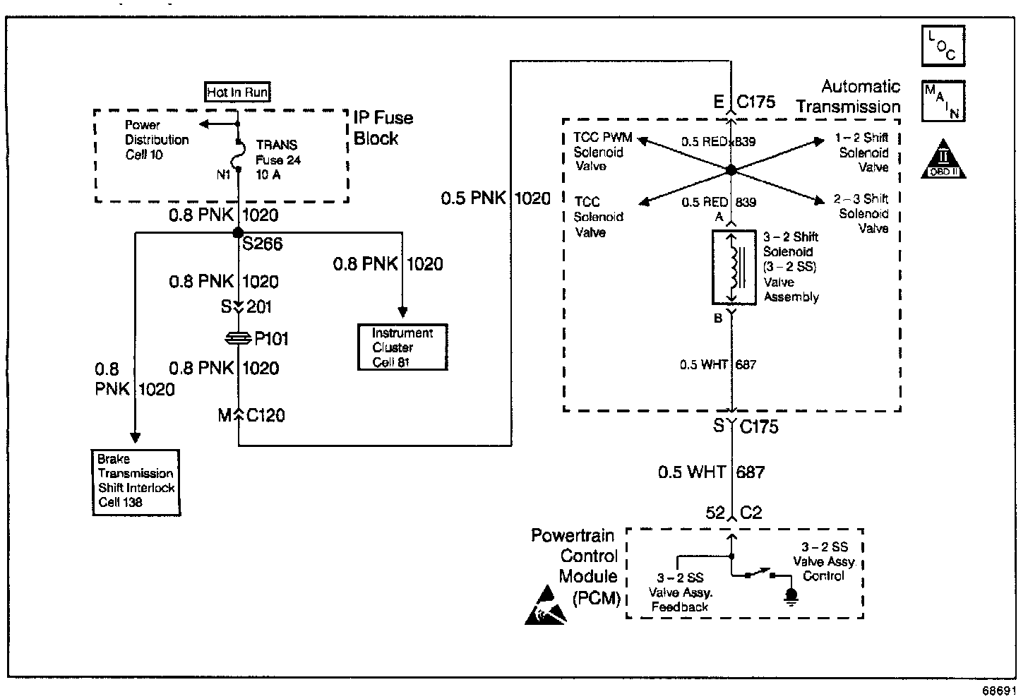 The 3-2 Shift Solenoid Valve Assembly (3-2 SS Valve Assy.) is a normally-closed, 3-port, on/off device that controls the 3-2 downshift. The solenoid attaches to the control valve body within the transmission. The solenoid receives ignition voltage through circuit 1020. The PCM controls the solenoid by providing a ground path on circuit 687. During a 3-2 downshift, the 2-4 band applies as the 3-4 clutch releases. The PCM varies the timing between the 3-4 clutch release and the 2-4 band apply depending on the vehicle speed and the throttle position. When the PCM detects a continuous open or short to ground in the 3-2 SS Valve Assy. circuit or the 3-2 SS Valve Assy., then DTC P0785 sets. DTC P0785 is a type A DTC.