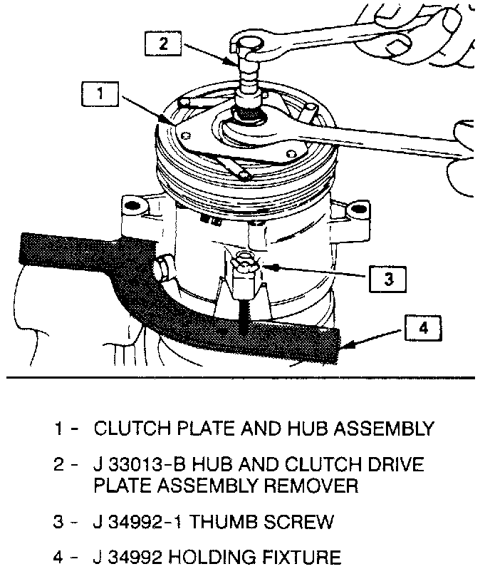 3. Thread the Clutch Plate and Hub Assembly Remover J 33013B into the hub. Hold the body of the remover with a wrench and turn the center screw into the remover body to remove the clutch plate and hub assembly.